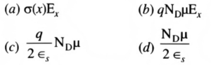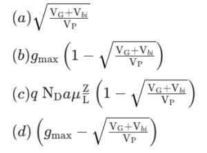NTA UGC NET/JRF Exam, June -2021 (Electronic Science)Total Questions: 10041. In enhancement type of MOSFET, at zero gate bias:(a) Channel conductance is very low (b) Channel conductance is very high (c) Channel resistance is very low (d) Channel resistance is very high Choose the correct answer from the options given below:A. (a) and (b) onlyB. (a) and (c) onlyC. (b) and (d) onlyD. (a) and (d) onlyCorrect Answer: D. (a) and (d) only42. The maximum operating frequency of a MOSFET is:Choose the correct answer from the options given below:A. (a) and (c) onlyB. (a) and (d) onlyC. (a) and (b) onlyD. (b) and (d) onlyCorrect Answer: B. (a) and (d) only43. In a Semiconductor Device operation, the current continuity equations are:Choose the correct answer from the options given below:A. (a) and (b) onlyB. (b) and (c) onlyC. (c) and (d) onlyD. (a) and (d) onlyCorrect Answer: C. (c) and (d) only44. In JFET, the current density in the x-direction is:Choose the correct answer from the options given below:A. (b) and (c) onlyB. (c) and (d) onlyC. (a) and (d) onlyD. (a) and (b) onlyCorrect Answer: D. (a) and (b) only45. In JFET, the transconductance in the saturation region is given by:Choose the correct answer from the options given below:A. (a) and (b) onlyB. (b) and (c) onlyC. (c) and (d) onlyD. (a) and (d) onlyCorrect Answer: B. (b) and (c) only46. Consider the system represented by y[n] = 2x[n] + 3:(a) The system is linear. (b) The system is non-linear. (c) The system does not have homogeneity property. (d) The system follows the additive property. Choose the correct answer from the options given below:A. (a) and (d) onlyB. (a) and (c) onlyC. (b) and (c) onlyD. (c) and (d) onlyCorrect Answer: C. (b) and (c) only47. Which of the following statements regarding the Fourier series are correct?(a) For an even symmetry, only sine terms exist. (b) For an even symmetry, only cosine terms exist. (c) For an odd symmetry, only cosine terms exist. (d) For an odd symmetry, only sine terms exist. Choose the correct answer from the options given below:A. (a) and (c) onlyB. (b) and (d) onlyC. (c) and (d) onlyD. (a) and (d) onlyCorrect Answer: B. (b) and (d) only48. Which of the following statements regarding Laplace and Fourier transforms are correct?(a) In order for a function to possess a Laplace transform, it must obey the condition(b) In order for a function to possess a Laplace transform, it must obey the condition(c) For a function to have a Fourier transform, it must obey the condition(d) For a function to have a Fourier transform, it must obey the conditionA. (a) and (c) onlyB. (b) and (c) onlyC. (b) and (d) onlyD. (a) and (d) onlyCorrect Answer: C. (b) and (d) only49. Which of the following statements are correct?(a) Schottky barriers are established by depositing a metal, such as Tungsten, on a p-type channel. (b) The transfer characteristics of a depletion type MESFET are similar to those of a depletion type MOSFEТ. (c) Maximum operating conditions are determined by the product of drain-tosource voltage and drain current. (d) A complimentary MOSFET has negligibly small input impedance. Choose the correct answer from the options given below:A. (a) and (c) onlyB. (a) and (d) onlyC. (b) and (c) onlyD. (b) and (d) onlyCorrect Answer: C. (b) and (c) only50. Which of the following statements are correct?(a) A multiplier can be used as a balanced demodulator or detector. (b) Dynamic range compression is the process of reducing the peak-to-peak variation of a signal to a lower range. (c) An antilogarithmic amplifier is useful for dynamic range compression. (d) In a phase-locked loop circuit, the capture range is always larger than the lock range. Choose the correct answer from the options given below:A. (a) and (b) onlyB. (a) and (c) onlyC. (b) and (c) onlyD. (b) and (d) onlyCorrect Answer: A. (a) and (b) onlySubmit Quiz« Previous12345678910Next »
