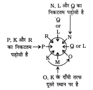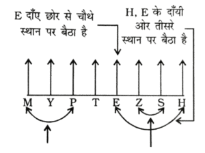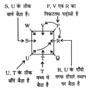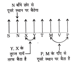 NTPC CBT-2 GROUP ‘D’ 09.05.2022 (प्रथम पाली)Total Questions: 3221. आठ व्यक्ति E, H, M, P, S, T, Y और Z एक सीधी पंक्ति में बैठे हैं। उन सभी का मुख उत्तर की ओर है। E पंक्ति के किसी एक सिरे से चौथे स्थान पर बैठा है। H, E के दाईं ओर तीसरे स्थान पर बैठा है। H के दाईं ओर जितने व्यक्ति बैठे है, M के बाई ओर उतने ही व्यक्ति बैठे है। M और P के बीच में केवल एक व्यक्ति बैठा है। S, Z के दाईं ओर ठीक बगल में बैठा है। Z और T के बीच केवल एक व्यक्ति बैठा है। Y के बाईं ओर कितने व्यक्ति बैठे हैं?(1) दो(2) तीन(3) एक(4) शून्यCorrect Answer: (3) एकSolution:प्रश्नानुसार,चूँकि जितना व्यक्ति H के दाँयी ओर बैठा है उतना ही व्यक्ति M के बाँयी ओर भी बैठा है लेकिन कोई भी व्यक्ति H के दायें तरफ नहीं बैठा है इसलिए M बाँये छोर पर बैठेगा। क्योंकि उसके बाँयी ओर भी कोई व्यक्ति नहीं बैठना चाहिए।उपर्युक्त बैठने के क्रम से Y के बायीं ओर केवल एक व्यक्ति बैठा है।22. आठ व्यक्ति M, N, P, S, T, V, X, और Y एक सीधी पंक्ति में बैठे हैं और सभी का मुख उत्तर की ओर है। N पंक्ति के किसी एक सिरे से दूसरे स्थान पर बैठा है। M और N के बीच केवल तीन व्यक्ति बैठे हैं। P, M के दाईं ओर दूसरे स्थान पर बैठा है। P के दाईं ओर जितने व्यक्ति बैठे हैं, उतने ही व्यक्ति S के बाईं ओर बैठे हैं। T और S के बीच केवल तीन व्यक्ति बैठे हैं। T पंक्ति के किसी भी सिरे पर नहीं बैठा है। Y, X के दाईं ओर ठीक बगल में बैठा है। V के बाईं ओर तीसरे स्थान पर कौन बैठा है?(1) P(2) M(3) X(4) YCorrect Answer: (4) YSolution:उपर्युक्त बैठने के क्रम से Y, V के बाँयी ओर तीसरे स्थान पर बैठा है।23. दिए गए कथनों और निष्कर्षों को ध्यानपूर्वक पढ़ें। कथनों में दी गई जानकारी को सत्य मानते हुए विचार करें, भले ही वह सामान्यतः ज्ञात तथ्यों से भिन्न प्रतीत होती हो, और तय करें कि दिए गए निष्कर्षों में से कौन-से कथनों का तार्किक रूप से पालन करते हैं?कथन :कुछ एथलीट व्यवसायी हैं।सभी व्यवसासी अमीर हैं।निष्कर्ष :I. कुछ एथलीट अमीर हैं।II. कोई एथलीट अमीर नहीं है।(1) न तो निष्कर्ष I और न ही II पालन करता है।(2) निष्कर्ष I और II दोनों पालन करते हैं।(3) केवल निष्कर्ष II पालन करता है।(4) केवल निष्कर्ष I पालन करता है।Correct Answer: (4) केवल निष्कर्ष I पालन करता है।Solution:कथनानुसार,निष्कर्षःI. कुछ खिलाड़ी, अमीर है। (√)II. कोई भी खिलाड़ी अमीर नहीं है। (x)केवल निष्कर्ष-I कथन का पालन करता है।24. आठ व्यक्ति P, Q, R, S, T, U, V और W रात के खाने के लिए एक वर्गाकार मेज के चारों ओर इस प्रकार बैठे हैं कि 4 व्यक्ति चारों कोनों पर बैठे हैं एवं 4 व्यक्ति चारों तरफ मध्य स्थिति में बैठे हैं। उन सभी का मुख वर्ग के केंद्र की ओर है। S, U के ठीक बायें बैठा है। U,T के ठीक बायें बैठा है। T भुजाओं के मध्य में किसी एक स्थान पर बैठा है। R, U के दायें से तीसरे स्थान पर बैठा है। P, V और R दोनों का निकटतम पडोसी है। W, T का निकटतम पडोसी नहीं है। निम्नलिखित में से कौन एक को
