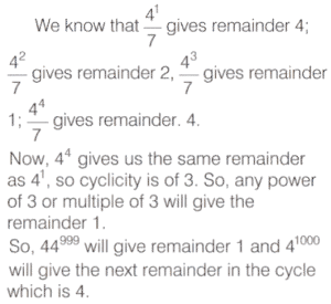 NUMBER SYSTEM (CDS)Total Questions: 101101. What is the remainder when 4¹⁰⁰⁰ is divided by 7? [2014 (I) Morning Shift ](a) 1(b) 2(c) 4(d) None of theseCorrect Answer: (c) 4Solution:Submit Quiz« Previous1234567891011