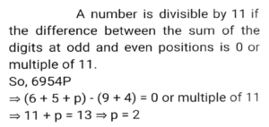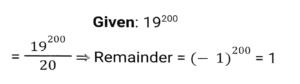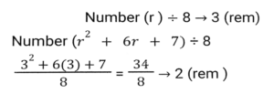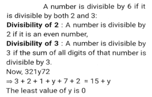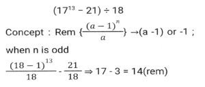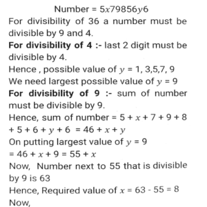 Number System (Part-2)Total Questions: 5031. If 321y72 is a multiple of 6, where y is a digit, what is the least value of y? [SSC CGL 13/09/2024 (1st Shift)](a) 3(b) 0(c) 7(d) 2Correct Answer: (b) 0Solution:32. At a cafe, Rama bought drinks for her 7 friends at ₹240. Some of them wanted coffee, while others wanted black tea. A regular cup of coffee cost ₹40 and a regular cup of black tea cost ₹ 30. How many cups of black tea did she purchase? [SSC CGL 13/09/2024 (1st Shift)](a) 5(b) 4(c) 3(d) 6Correct Answer: (b) 4Solution:33. Find the remainder: (17¹³ - 21) ÷18 [SSC CGL 13/09/2024 (3rd Shift)](a) 15(b) 17(c) 14(d) 21Correct Answer: (c) 14Solution:34. Find the least value of x for which 57x716 is divisible by 9. [SSC CGL 17/09/2024 (2nd Shift)](a) 1(b) 9(c) 0(d) 8Correct Answer: (a) 1Solution:35. If P is a digit such that 6954P is divisible by 11, then P equals: [SSC CGL 17/09/2024 (3rd Shift)](a) 2(b) 8(c) 6(d) 7Correct Answer: (a) 2Solution:36. When f(m) = m⁵+5m⁴-3m + 7 is divided by (m-2), then the remainder is______ . [SSC CGL 17/09/2024 (3rd Shift)](a) 7(b) 5(c) 0(d) 113Correct Answer: (d) 113Solution:37. A number r when divided by 8 leaves remainder 3. What will be the remainder when (r²+6r+7) is divided by 8?(a) 2(b) 3(c) 1(d) 4Correct Answer: (a) 2Solution:38. Find the remainder, if 19²⁰⁰ is divided by 20. [SSC CGL 18/09/2024 (2nd Shift)](a) 2(b) -1(c) 1(d) 3Correct Answer: (c) 1Solution:39. Which of the following fractions is the largest? [SSC CGL 18/09/2024 (2nd Shift)]2/3, 6/53, 79/90, 33/44(a) 2/3(b) 33/44(c) 6/53(d) 79/90Correct Answer: (d) 79/90Solution:40. If the 9-digit number 5x79856y6 is divisible by 36, then what is the negative value of √(2x + y) for the largest possible value of y, given x and y are natural numbers? [SSC CGL 18/09/2024 (3rd Shift)](a) -7(b) -2(c) -4(d) -5Correct Answer: (d) -5Solution:Submit Quiz« Previous12345Next »