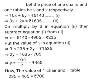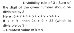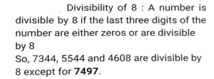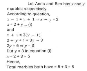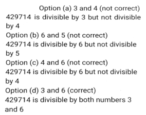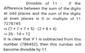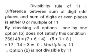 Number System (Part-2)Total Questions: 5041. Anna and Ben each have a collection of marbles. If Anna gives one marble to Ben, they will both have an equal number of marbles. Conversely, if Ben gives one marble to Anna, she will end up with three times the number of marbles that Ben has. What is the total number of marbles they both have? [SSC CGL 18/09/2024 (3rd Shift)](a) 10(b) 8(c) 11(d) 9Correct Answer: (b) 8Solution:42. What number should be subtracted from x³ - 4x² - 8x + 11 to make the number divisible by (x + 2)? [SSC CGL 19/09/2024 (1st Shift)](a) 9(b) 5(c) 3(d) 7Correct Answer: (c) 3Solution:43. Each of Ravi and Kavita had some marbles. Kavita had 12 more marbles than Ravi had. If each of them had one more marble, then three times the number of marbles Kavita would then have had would have been equal to four times the number of marbles Ravi would then have had. How many marbles did Kavita actually have?(a) 43(b) 47(c) 51(d) 48Correct Answer: (b) 47Solution:44. From the given numbers A, B, C and D, which number is NOT divisible by 11? [SSC CGL 19/09/2024 (2nd Shift)]A = 712712 B = 177210 C = 64614 D = 756148(a) C(b) D(c) B(d) ACorrect Answer: (b) DSolution:45. Which of the following numbers is NOT divisible by B? [SSC CGL 19/09/2024 (3rd Shift)](a) 7344(b) 5544(c) 7497(d) 4608Correct Answer: (c) 7497Solution:46. For what least value of n, 2²ⁿ+ 2n is completely divided by 6, where n is an integer? [SSC CGL 23/09/2024 (1st Shift)](a) 3(b) 1(c) 0(d) 2Correct Answer: (b) 1Solution:47. The least number which must be subtracted from 7278745 so as to obtain a sum divisible by 11 is: [SSC CGL 23/09/2024 (2nd Shift)](a) 3(b) 1(c) 5(d) 2Correct Answer: (b) 1Solution:48. Ten chairs and six tables together cost 5,140; three chairs and two tables together cost ₹1,635. The cost of 1 chair and 1 table is: [SSC CGL 23/09/2024 (2nd Shift)](a) ₹900(b) ₹600(c) ₹800(d) ₹700Correct Answer: (d) ₹700Solution:49. The number 4,29,714 is divisible by: [SSC CGL 23/09/2024 (3rd Shift)](a) 3 and 5(b) 6 and 5(c) 4 and 6(d) 3 and 6Correct Answer: (d) 3 and 6Solution:50. Find the greatest value of 'k' in a 6-digit number 6745k2 such that the number is divisible by 3. [SSC CGL 24/09/2024 (1st Shift)](a) 8(b) 6(c) 9(d) 7Correct Answer: (c) 9Solution:Submit Quiz« Previous12345