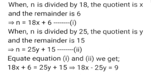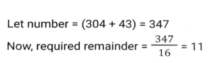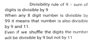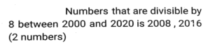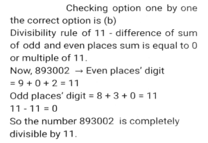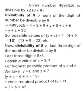 Number System (Part-3)Total Questions: 5011. How many numbers lie between 2000 and 2020 that are divisible by 8? [SSC CHSL 02/07/2024 (1st Shift)](a) 4(b) 3(c) 2(d) 5Correct Answer: (c) 2Solution:12. On dividing a certain number by 304, we get 43 as the remainder. If the same number is divided by 16, what will be the remainder? [SSC CHSL 02/07/2024 (2nd Shift)](a) 8(b) 11(c) 15(d) 12Correct Answer: (b) 11Solution:13. The sum of the five consecutive even numbers is 2720. The sum of the third and fifth numbers is: [SSC CHSL 02/07/2024 (2nd Shift)](a) 1392(b) 1192(c) 1092(d) 1292Correct Answer: (c) 1092Solution:14. What is the number of digits required for numbering a book with 428 pages? [SSC CHSL 02/07/2024 (4th Shift)](a) 1500(b) 2000(c) 988(d) 1176Correct Answer: (d) 1176Solution:15. An 8 digit number is divisible by 99. If the digits are shuffled, then the number is always divisible by_______ . [SSC CHSL 03/07/2024 (1st Shift)](a) 9(b) 11(c) 6(d) 5Correct Answer: (a) 9Solution:16. When a number is divided by 512 it leaves a remainder 67. If the same number is divided by 32, then what will be the remainder? [SSC CHSL 03/07/2024 (1st Shift)](a) 5(b) 0(c) 4(d) 3Correct Answer: (d) 3Solution:17. Find the remainder when 179 x 172 x 173 is divided by 17. [SSC CHSL 03/07/2024 (2nd Shift)](a) 2(b) 9(c) 3(d) 6Correct Answer: (c) 3Solution:18. A seven-digit number 489y5z6 is divisible by 72. Which of the options gives the highest possible product of y and z?(a) 3(b) 42(c) 30(d) 21Correct Answer: (b) 42Solution:19. When the integer n is divided by 18, the quotient is x and the remainder is 6. When the integer in is divided by 25, the quotient is y and the remainder is 15. Which of the following is true? [SSC CHSL 03/07/2024 (4th Shift)](a) 18x - 25y = 9(b) 18x + 25y = 9(c) 25y - 18x = 9(d) 25y +18x = 9Correct Answer: (a) 18x - 25y = 9Solution:20. Which of the following numbers is divisible by 22 ? [SSC CHSL 04/07/2024 (1st Shift)](a) 654320(b) 893002(c) 602351(d) 645372Correct Answer: (b) 893002Solution:Submit Quiz« Previous12345Next »