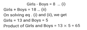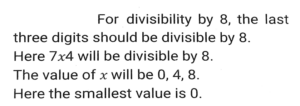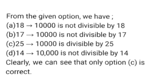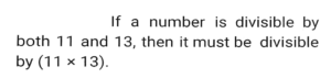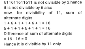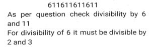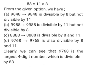 Number System (Part-3)Total Questions: 5041. The number 611611611611 is: [SSC CHSL 11/07/2024 (4th Shift)](A) divisible by both 6 and 11 (B) neither divisible by 6 nor by 11 (C) divisible by 6 only (D) divisible by 11 only(a) (B)(b) (D)(c) (A)(d) (C)Correct Answer: (b) (D)Solution:42. Arrange the following ratios in ascending order. [SSC CPO 28/06/2024 (3rd Shift)]3 : 4,3 : 5, 2 : 11, 7 : 2(a) 3 : 5<2 : 11<3 : 4<7 : 2(b) 7 : 2<3 : 4<3 : 5<2 : 11(c) 2 :11<3 : 5<3 : 4<7 : 2(d) 3 : 4<3 : 5<2 : 11< 7 : 2Correct Answer: (c) 2 :11<3 : 5<3 : 4<7 : 2Solution:43. 18 students of a class took part in a quiz. If the number of girls is 8 more than the number of boys, find the product of the number of boys and girls. [SSC CPO 29/06/2024 (2nd Shift)](a) 56(b) 36(c) 63(d) 65Correct Answer: (d) 65Solution:44. Which of the following numbers is divisible by 11? [Matriculation Level 20/06/2024 (Shift-1)](a) 908781(b) 969331(c) 701611(d) 611571Correct Answer: (b) 969331Solution:45. The number 10000 is exactly divisible by which of the following numbers? [Matriculation Level 20/06/2024 (Shift-1)](a) 18(b) 17(c) 25(d) 14Correct Answer: (c) 25Solution:46. If the number 3727x4 is completely divisible by 8, then the smallest integer in place of x will be [Matriculation Level 21/06/2024 (Shift-1)](a) 6(b) 8(c) 2(d) 0Correct Answer: (d) 0Solution:47. Which of the following is a condition of divisibility of a number by six? [Matriculation Level 21/06/2024 (Shift-4) ](a) Sum of digits is divisible by 6(b) Last digit is 3 or 6(c) Sum of digits is divisible by 3 and last digit is even(d) Sum of digits is divisible by 3 and first digit is evenCorrect Answer: (c) Sum of digits is divisible by 3 and last digit is evenSolution:48. The largest 4-digit number that is exactly divisible by 88 is: [Matriculation Level 21/06/2024 (Shift-4)](a) 9848(b) 9988(c) 8888(d) 9768Correct Answer: (d) 9768Solution:49. Find the least value digit which is assigned to x so that the number 1972x471 is divisible by 9. [Matriculation Level 24/06/2024 (Shift-1)](a) 3(b) 5(c) 4(d) 2Correct Answer: (b) 5Solution:50. If a number is divisible by both 11 and 13, then it must be: [Matriculation Level 24/06/2024 (Shift-4)](a) divisible by (11 x 13)(b) divisible by 42(c) divisible by (11 +13)(d) divisible by (13 -11)Correct Answer: (a) divisible by (11 x 13)Solution:Submit Quiz« Previous12345
