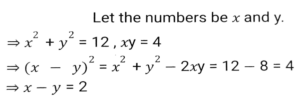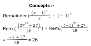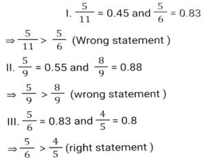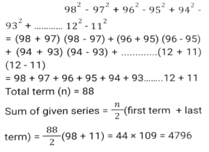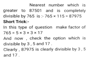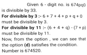 Number System (Part-5)Total Questions: 5021. What is the value of 98² - 97² + 96² - 95² + 94² - 93² +...........12² - 11² [SSC CHSL 17/03/2023 (4th Shift)](a) 4725(b) 4796(c) 4851(d) 4926Correct Answer: (b) 4796Solution:22. If the sum of squares of two real numbers is 12 and the product of the numbers is 4, find the difference between the numbers. [SSC CHSL 20/03/2023 (3rd Shift)](a) 4(b) 8(c) 1(d) 2Correct Answer: (d) 2Solution:23. Which of the following is largest among (125)¹⁄⁶, (11)¹⁄³, (12)¹⁄⁶, (5)¹⁄⁴ ? [SSC CHSL 21/03/2023 (3rd Shift)](a) (12)¹⁄⁶(b) (11)¹⁄³(c) (125)¹⁄⁶(d) (5)¹⁄⁴Correct Answer: (c) (125)¹⁄⁶Solution:24. Which of the following statements is true? [SSC CHSL 21/03/2023 (4th Shift)]I. 5/11 > 5/6 II. 5/9 > 8/9 III. 5/6 > 4/5(a) Only III(b) Both I and II(c) Only II(d) Only ICorrect Answer: (a) Only IIISolution:25. The number 5769116 is divisible by which of the following numbers? [SSC CGL Tier II (02/03/2023)](a) 4(b) 5(c) 12(d) 8Correct Answer: (a) 4Solution:5769116 is divivsible by 4 as its last two digits are divisible by 4.26. What will be the remainder when 27²⁷ + 27 is divided by 28 ? [SSC CGL 01/12/2022 (3rd Shift)](a) 28(b) 27(c) 25(d) 26Correct Answer: (d) 26Solution:27. In a class of students, the first student has 2 toffees, second has 4 toffees, third has 6 toffees and so on. If the number of students in the class is 25, then the total number of toffees are divisible by_______. [SSC CGL 02/12/2022 (2nd Shift)](a) 5 and 7(b) 5 and 13(c) 11 and 13(d) 7 and 11Correct Answer: (b) 5 and 13Solution:28. The difference of two numbers is 1564. After dividing the larger number by the smaller, we get 6 as quotient and 19 as remainder. What is the smaller number? [SSC CGL 02/12/2022 (3rd Shift)](a) 456(b) 287(c) 623(d) 309Correct Answer: (d) 309Solution:29. The nearest number which is greater to 87501, and is completely divisible by 765 is: [SSC CGL 03/12/2022 (1st Shift)](a) 88975(b) 87975(c) 87966(d) 87775Correct Answer: (b) 87975Solution:30. Which of the following pairs of non-zero values of p and q make 6-digit number 674pq0 divisible by both 3 and 11? [SSC CGL 05/12/2022 (1st Shift)](a) p = 2 and q = 2(b) p = 5 and q = 4(c) p = 4 and q = 2(d) p = 5 and q = 2Correct Answer: (d) p = 5 and q = 2Solution:Submit Quiz« Previous12345Next »