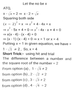 Number System (Part-6)Total Questions: 3611. Ishita can read a newspaper in 'n' minutes. What part of the newspaper can she read in 7 minutes? (n > 7) [SSC MTS 12/07/2022 (Morning)](a) n/7(b) 7n²(c) 7n(d) 7/nCorrect Answer: (d) 7/nSolution:12. How many multiples of 7 are there between 100 and 200? [SSC MTS 22/07/2022 (Evening)](a) 14(b) 15(c) 12(d) 16Correct Answer: (a) 14Solution:13. On dividing 8675123 by a certain number, the quotient is 33611 and the remainder is 3485. The divisor is________ . [SSC CHSL 25/05/2022 (Afternoon)](a) 538(b) 258(c) 248(d) 356Correct Answer: (b) 258Solution:14. The difference between a number and the square root of the number is 2. The number is: [SSC CHSL 26/05/2022 (Afternoon)](a) 1(b) 2(c) 3(d) 4Correct Answer: (d) 4Solution:15. Which of the following can be a rationalizing factor of (√2 + √3 + √5) ? [SSC CHSL 27/05/2022 (Afternoon)](a) √2 - √3 - √5 √6(b) √2 + √3 - √5 √6(c) √2 - √3 + √5 √6(d) √2 + √3 + √5 √6Correct Answer: (b) √2 + √3 - √5 √6Solution:16. When f(x) = 15x³ - 14x² - 4x + 10 is divisible by (3x + 2), then the remainder is: [SSC CHSL 27/05/2022 (Afternoon)](a) -1(b) 1(c) -2(d) 2Correct Answer: (d) 2Solution:17. If a positive integer N is divided by 7, the remainder is 3. Which of the following numbers yields a remainder of 0 when it is divided by 7? [SSC CHSL 27/05/2022 (Evening)](a) N + 5(b) N + 2(c) N + 4(d) N + 3Correct Answer: (c) N + 4Solution:18. The sum of the first 78 natural numbers from 1 to 78 is divisible by [SSC CHSL 01/06/2022 (Evening)](a) 79(b) 61(c) 29(d) 30Correct Answer: (a) 79Solution:19. A number x is three times another number y. If the sum of both the numbers is 20, then x and y, respectively, are: [SSC CHSL 10/06/2022 (Evening)](a) 8 and 12(b) 15 and 5(c) 5 and 15(d) 2 and 18.Correct Answer: (b) 15 and 5Solution:20. How many numbers are there from 500 to 650 (including both) which are neither divisible by 3 nor by 7? [SSC CGL 11/04/2022 (Afternoon)](a) 21(b) 121(c) 87(d) 99Correct Answer: (c) 87Solution:Submit Quiz« Previous1234Next »