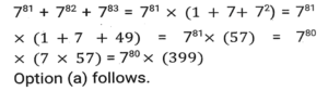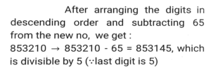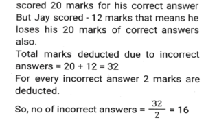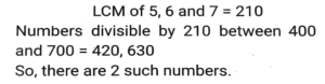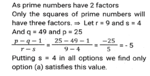 Number SystemTotal Questions: 5031. In a test (+5) marks are given for every correct answer and (-2) marks are given for every incorrect answer. Jay answered all the questions and scored (-12) marks, though he got 4 correct answers. How many of his answers were INCORRECT? [SSC CPO 11/11/2022 (Evening)](a) 8(b) 32(c) 16(d) 20Correct Answer: (c) 16Solution:32. The number 150328 is divisible by 23. If the digits are rearranged in descending order and five times of 13 is subtracted from the new number thus formed, then the resultant number will be divisible by: [SSC CPO 10/11/2022 (Morning)](a) 3(b) 5(c) 11(d) 2Correct Answer: (b) 5Solution:33. What is the sum of all the common terms between the given series S1 and S2 ? [SSC CGL Tier II (08/08/2022)]S1 = 2, 9, 16, ....... , 632 S2 = 7, 11, 15, ....... , 743(a) 6974(b) 6750(c) 7140(d) 6860Correct Answer: (a) 6974Solution:34. Let p, q, r and s be positive natural numbers having three exact factors including 1 and the number itself if q > p and both are two-digit numbers, and r > s and both are one-digit numbers, then the value of the expression (p - q - 1)/(r - s) is: [SSC CGL Tier II (03/02/2022)](a) - s - 1(b) s - 1(c) 1- s(d) s + 1Correct Answer: (a) - s - 1Solution:35. Three fractions x, y and z are such that x > y > z When the smallest of them is divided by the greatest, the result is 9/16 which exceeds y by 0.0625. If x + y + z = 2³⁄₁₂ then what is the value of x + z ? [SSC CGL Tier II (29/01/2022)](a) 5/4(b) 1/4(c) 7/4(d) 3/4Correct Answer: (c) 7/4Solution:36. How many numbers between 400 and 700 are divisible by 5, 6 and 7 ? [SSC CPO 24/11/2020 (Evening)](a) 2(b) 5(c) 10(d) 20Correct Answer: (a) 2Solution:37. Find the number of prime factors in the product (30)⁵ x (24)⁵. [SSC CGL Tier II (18/11/2020)](a) 45(b) 35(c) 10(d) 30Correct Answer: (b) 35Solution:38. Let ab, a ≠ b is a 2-digit prime number such that ba is also a prime number. The sum of all such number is: [SSC CGL Tier II (16/11/2020)](a) 374(b) 418(c) 407(d) 396Correct Answer: (b) 418Solution:39. Given that 2²⁰ + 1 is completely divisible by a whole number. Which of the following is completely divisible by the same number? [SSC CHSL 16/10/2020 (Afternoon)](a) 2¹⁵ + 1(b) 5 x 2³⁰(c) 2⁹⁰ + 1(d) 2⁶⁰ + 1Correct Answer: (d) 2⁶⁰ + 1Solution:40. Which of the following numbers will completely divide 7⁸¹ + 7⁸² + 7⁸³ ? [SSC CHSL 17/03/2020 (Morning)](a) 399(b) 389(c) 387(d) 397Correct Answer: (a) 399Solution:Submit Quiz« Previous12345Next »