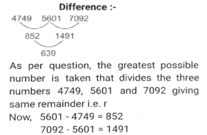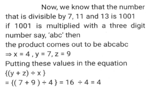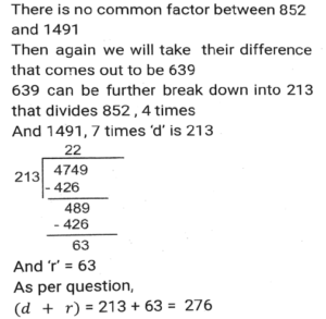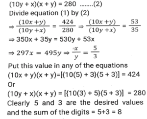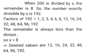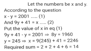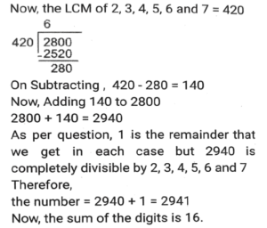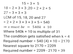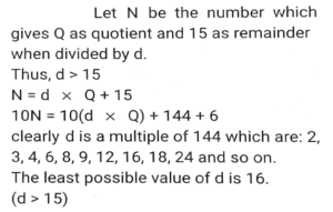 Number SystemTotal Questions: 5041. When a positive integer is divided by d, the remainder is 15. When ten times of the same number is divided by d, the remainder is 6. The least possible value of d is: [SSC CGL 05/03/2020 (Afternoon)](a) 9(b) 12(c) 16(d) 18Correct Answer: (c) 16Solution:42. When 200 is divided by a positive integer x, the remainder is 8. How many values of x are there? [SSC CGL 03/03/2020 (Afternoon)](a) 7(b) 5(c) 8(d) 6Correct Answer: (c) 8Solution:43. How many natural numbers lesn than 1000 are divisible by 5 or 7 but NOT by 35? [SSC CPO 11/12/2019 (Morning)](a) 285(b) 313(c) 341(d) 243Correct Answer: (a) 285Solution:44. If r is the remainder when each of 4749, 5601 and 7092 is divided by the greatest possible number d (>1), then the value of (d+r) will be: [SSC CPO 11/12/2019 (Morning)](a) 276(b) 271(c) 298(d) 282Correct Answer: (a) 276Solution:45. Let x be the least 4-digit number which when divided by 2, 3, 4, 5, 6 and 7 leaves a remainder of 1 in each case. If x lies between 2800 and 3000, then what is the sum of digits of x ? [SSC CPO 09/12/2019 (Evening)](a) 15(b) 16(c) 12(d) 13Correct Answer: (b) 16Solution:46. If the six digit number 479xyz is exactly divisible by 7, 11 and 13, then {(y +z)÷x} is equal to: [SSC CPO 09/12/2019 (Morning)](a) 11/9(b) 4(c) 13/7(d) 7/13Correct Answer: (b) 4Solution:47. Which among the following is the smallest ? [SSC CPO 09/12/19 (Morning)](a) √401-√399(b) √101-√99(c) √301-√299(d) √201-√199Correct Answer: (a) √401-√399Solution:48. Two positive numbers differ by 2001. When the larger number is divided by the smaller number, the quotient is 9 and the remainder is 41. The sum of the digits of the larger number is: [SSC CGL Tier II (13/09/2019)](a) 15(b) 11(c) 10(d) 14Correct Answer: (d) 14Solution:49. When a two digit number is multiplied by the sum of its digits, the product is 424. When the number obtained by interchanging its digits is multiplied by the sum of the digits, the result is 280. The sum of the digits of the given number is: [SSC CGL Tier II (12/09/2019)](a) 6(b) 9(c) 8(d) 7Correct Answer: (c) 8Solution:50. Let x be the least number which when divided by 15,18,20 and 27, the remainder in each case is 10 and x is a multiple of 31. What least number should be added to x to make it a perfect square? [SSC CGL Tier II (12/09/2019)](a) 39(b) 37(c) 43(d) 36Correct Answer: (a) 39Solution:Submit Quiz« Previous12345