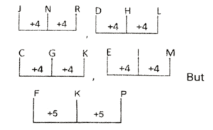Odd One Out – Railway Reasoning part – VIITotal Questions: 5031. Find the word that is not related to the group? [RPF Constable 18/01/2019 (Evening)]I, A, Y, O, E(a) Y(b) E(c) I(d) ACorrect Answer: (a) YSolution:Except Y all are vowels. so the odd one is Y.32. Find the words that are not related to the group? [RPF Constable 18/01/2019 (Evening)]BC, LK, MN, XY, NO(a) XY(b) NO(c) BC(d) LKCorrect Answer: (d) LKSolution:First letter + 1 = Second Letter.B + 1 = C, M + 1 = N, X + 1 = Y, N + 1 = OBut, L + 1 = M (Not K)33. Choose the odd one from the following. [RPF Constable 19/01/2019 (Morning)]DB, MK, PN, XV, ZW(a) PN(b) ZW(c) DB(d) XVCorrect Answer: (b) ZWSolution:The difference between the two letters is 2.D - B = 2, M - K = 2, P - N = 2, X - V = 2,Z - W = 3 (Not 2)The odd one is ZW.34. Choose the odd one from the following. [RPF S.I. 19/12/2018 (Morning)]AEI, MQU, KNS, CGK, LPT(a) LPT(b) CGK(c) KNS(d) AEICorrect Answer: (c) KNSSolution:AEI ⇒ A + 4 = E, E + 4 = IMQU ⇒ M + 4 = Q, Q + 4 = UKNS ⇒ K + 4 ≠ N, N + 4 ≠ S (odd)CGK ⇒ C + 4 = G, G + 4 = KLPT ⇒ L + 4 = P, P + 4 = T35. Which one of the following does not belong to the group? [RPF S.I. 19/12/2018 (Morning)]R, Z, B, N, U(a) N(b) Z(c) U(d) RCorrect Answer: (c) USolution:Except U all others are consonants.36. Choose the odd one from the following. [RPF S.I. 19/12/2018 (Evening)]L, Y, K, M, E(a) K(b) Y(c) M(d) ECorrect Answer: (d) ESolution:Except E, all the other letters have two digits in their place value.37. Which one of the following does not belong to the group? [RPF S.I. 19/12/2018 (Evening)]NLJ, TRP, XVT, HFD, IMF(a) NLJ(b) HFD(c) IMF(d) TRPCorrect Answer: (c) IMFSolution:Except IMF all others follow the same pattern as shown in below diagram. 38. Which one of the following does not belong to the group? [RPF S.I. 20/12/2018 (Morning)]Piglet, Cub, Calf, Lion, Lamb(a) Piglet(b) Lamb(c) Lion(d) CalfCorrect Answer: (c) LionSolution:Except Lion all are the names of the baby animals like:- 39. Choose the odd one from the following. [RPF S.I. 05/01/2019 (Morning)]Q, M, I, S, T(a) T(b) S(c) Q(d) MCorrect Answer: (a) TSolution:Except T all letters place value is odd hence T is odd from others.40. Find out the odd set of letters from the given alternatives. [RPF S.I. 10/01/2019 (Morning)]JNR, DHL, CGK, EIM, FKP(a) CGK(b) DHL(c) JNR(d) FKPCorrect Answer: (d) FKPSolution:Submit Quiz« Previous12345Next »