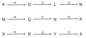 Odd One Out (Varieties Questions)Total Questions: 291. Three of the following four are alike in a certain way and thus form a group. Which is the one that does NOT belong to that group? [S.S.C CHSL Tier II (10/01/2024)]NOTE: (Operations should be performed on the whole numbers, without breaking down the numbers into its constituent digits. E.g., 13 – Operations on 13 such as adding / subtracting / multiplying etc., to 13 can be performed. Breaking down 13 into 1 and 3 and then performing mathematical operations on 1 and 3 is not allowed.)(a) 364 - 182(b) 438 - 219(c) 524 - 260(d) 986 - 493Correct Answer: (c) 524 - 260Solution:(1st number) ÷ 2 = 2nd number(364, 182) → 364 ÷ 2 = 182 (438, 219) → 438 ÷ 2 = 219 (986, 493) → 986 ÷ 2 = 493But, (524, 260) → 524 ÷ 2 = 262 (Not 260)Hence, (524, 260) is the correct answer.2. Three of the following letter-clusters are alike in same manner and one is different. Select the one that is different. [S.S.C CPO 03/10/2023 (3rd Shift)](a) QJPK(b) KOLN(c) MQNP(d) XBYACorrect Answer: (a) QJPKSolution:The pattern followed here is :But,Hence, QJPK is the correct answer.3. Select the word-pair that does NOT represent a similar relationship to the one expressed in the pair of words given below. [S.S.C CHSL 17/08/2023 (3rd Shift)](The words must be considered as meaningful English words and must not be related to each other based on the number of letters, consonants/vowels in the word.)Absence : Existence(a) Blunt : Sharp(b) Calm : Furious(c) Abundant : Lacking(d) Careful : CautiousCorrect Answer: (d) Careful : CautiousSolution:All the given options are Antonym to each other except the option (d), in which 'careful' and 'cautious' are synonyms to each other.4. Three of the following number triads are alike in some manner and one is different. Select the odd number triad. [S.S.C CHSL 14/08/2023 (2nd Shift)]NOTE: (The second and third numbers in the given number triads are formed by performing a certain operation on the first number. The same operation is followed in all the number triads except one. Find that odd number triad.)(a) 3 : 21 : 147(b) 8 : 56 : 3100(c) 1 : 7 : 49(d) 10 : 70 : 490Correct Answer: (b) 8 : 56 : 3100Solution:The pattern followed here is :(1st number) × 7 = 2nd number, (2nd number) × 7 = 3rd number (3 : 21 : 147) → (3 × 7 = 21), (21 × 7 = 147) (1 : 7 : 49) → (1 × 7 = 7), (7 × 7 = 49) (10 : 70 : 490) → (10 × 7 = 70), (70 × 7 = 490) But,(8 : 56 : 3100) → (8 × 7 = 56), (56 × 7 ≠ 3100)Hence, (8 : 56 : 3100) is the correct answer.5. Based on the alphabetical order, three of the following four are alike in a certain way and thus form a group. Which is the one that does not belong to that group? [S.S.C CHSL 10/08/2023 (2nd Shift)](a) CYF(b) OJL(c) LGI(d) UPRCorrect Answer: (a) CYFSolution:The pattern followed here is :But,Hence, CYF is the correct answer.6. Four number-pairs have been given, out of which three are alike in some manner and one is different. Select the one that is different. [S.S.C CHSL 07/08/2023 (2nd Shift)]NOTE: (Operations should be performed on the whole numbers, without breaking down the numbers into its constituent digits.)15 : 126, 27 : 234, 31 : 270, 17 : 162(a) 17 : 162(b) 15 : 126(c) 27 : 234(d) 31 : 270Correct Answer: (a) 17 : 162Solution:The pattern followed here is :(1st number × 9) − 9 = 2nd number (15 : 126) → (15 × 9) − 9 = 126 (27 : 234) → (27 × 9) − 9 = 234 (31 : 270) → (31 × 9) − 9 = 270 But,(17 : 162) → (17 × 9) − 9 = 144 (Not 162)Hence, (17 : 162) is the correct answer7. Three of the following number pairs are alike in some manner and one is different. Select the odd number pair. [S.S.C CHSL 03/08/2023 (3rd Shift)]Note: (The second number in the given number pairs is formed by performing a certain operation on the first number. The same operation is followed in all the number pairs except one. Find that odd number pair.)(a) 55 : 10(b) 80 : 13(c) 20 : 3(d) 95 : 18Correct Answer: (b) 80 : 13Solution:The logic followed here is :(2nd number × 5) + 5 = 1st number (55 : 10) → (10 × 5) + 5 = 55 (20 : 3) → (3 × 5) + 5 = 20 (95 : 18) → (18 × 5) + 5 = 95 But,(80 : 13) → (13 × 5) + 5 = 70 (Not 80)Hence, (80 : 13) is the correct answer.8. Find the odd number pair. [S.S.C CGL 27/07/2023 (2nd shift)](a) (8, 320)(b) (11, 968)(c) (5, 100)(d) (6, 108)Correct Answer: (c) (5, 100)Solution:The pattern followed here is :(1st number)² × (1st number − 3) = 2nd number (8, 320) → 8² × (8 − 3) ⇒ 64 × 5 = 320 (11, 968) → 11² × (11 − 3) ⇒ 121 × 8 = 968 (6, 108) → 6² × (6 − 3) ⇒ 36 × 3 = 108 But,(5, 100) → 5² × (5 − 3) ⇒ 25 × 2 = 50 (Not 100)9. Find the odd number pair. [S.S.C CGL 20/07/2023 (4th shift)](a) 9 : 18 : 728(b) 6 : 12 : 215(c) 2 : 4 : 7(d) 5 : 10 : 126Correct Answer: (d) 5 : 10 : 126Solution:The pattern followed here is :(1st number) × (2nd number ÷ 2)² − 1 = 3rd number (9 : 18 : 728) → {9 × (18 ÷ 2)²} − 1 ⇒ (9 × 81) − 1 ⇒ 729 − 1 = 728 (6 : 12 : 215) → {6 × (12 ÷ 2)²} − 1 ⇒ (6 × 36) − 1 ⇒ 216 − 1 = 215 (2 : 4 : 7) → {2 × (4 ÷ 2)²} − 1 ⇒ (2 × 4) − 1 ⇒ 8 − 1 = 7 But,(5 : 10 : 126) → {5 × (10 ÷ 2)²} − 1 ⇒ (5 × 25) − 1 ⇒ 125 − 1 = 124(Not 126)Hence, (5 : 10 : 126) is the correct answer.10. Find that odd number pair. [S.S.C CGL 19/07/2023 (4th shift)](a) (125, 91)(b) (64, 61)(c) (27, 37)(d) (8, 20)Correct Answer: (d) (8, 20)Solution:The logic here is :(125, 91) → (5³, 5 × (5 + 1) × 3 + 1)(64, 61) → (4³, 4 × (4 + 1) × 3 + 1)(27, 37) → (3³, 3 × (3 + 1) × 3 + 1)But,(8, 20) → (2³, 2 × (2 + 1) × 3 + 1) → (8, 19) ≠ (8, 20)Hence, (8, 20) is the correct answer.Submit Quiz123Next »
