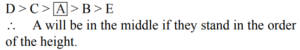 ORDER AND RANKING (General Mental Ability) UPSC EPFOTotal Questions: 301. Anita ranks twelfth in a class of forty six. What will be her rank from the last?(a) 34th(b) 35th(c) 36th(d) 37thCorrect Answer: (b) 35thSolution:Rank of Anita from the last = [Total students – her rank from first] + 1 = (46 – 12) + 1 = 35th.2. Rakesh ranks 7th from the top and 28th from the bottom in a class. How many students are there in the class?(a) 34th(b) 35th(c) 36th(d) 37thCorrect Answer: (a) 34thSolution:Total no. of students = [7 + 28] – 1 = 34th [Rank from top + Rank from bottom – 1]3. In a row of girls, Shilpa is eighth from the left and Reena is seventeenth from the right. If they interchange their positions, Shilpa becomes fourteenth from the left. How many girls are there in the row?(a) 34th(b) 35th(c) 30th(d) 37thCorrect Answer: (c) 30thSolution:Total no. of girls = [present position of Shilpa + previous position of Reena] – 1 = (14 + 17) – 1 = 304. In a row of children, Dipa is fifth from the left and Vijay is sixth from the right. When they interchange their places among themselves, Dipa becomes thirteenth from the left. Then what will be Vijay’s position from the right ?(a) 4th(b) 14th(c) 8th(d) 12thCorrect Answer: (b) 14thSolution:Present postion of Vijay = Difference of the two postions of Dipa + previous postion of Vijay = (13 – 5) + 6 = 14th5. Mohan is older than Prabir, Suresh is younger than Prabir. Mihir is older than Suresh but younger than Prabir. Who among the four is the youngest?(a) Prabir(b) Mihir(c) Mohan(d) SureshCorrect Answer: (d) SureshSolution:Mohan > Prabir > Suresh Prabir > Mihir > Suresh Hence, Mohan > Prabir > Mihir > Suresh6. M is older than R. Q is younger than R and N. N is not as old as M. Who among M, N, R and Q is the oldest?(a) M(b) R(c) M or R(d) Data inadequateCorrect Answer: (a) MSolution:R < M; Q < R, N; N < M M > N / R > Q7. Among five friends Mahesh is taller than Karan but not Yash. Hrithik is taller than Yash but not Abhishek. If they stand in increasing order of their heights, who will be first in line ?(a) Abhishek(b) Yash(c) Karan(d) Data inadequateCorrect Answer: (c) KaranSolution:Yash > Mahesh > Karan Abhishek > Hrithik > Yash Karan < Mahesh < Yash < Hrithik < Abhishek8. Akshay is 16th from the left end in the row of boys and Vijay is 18th from the right end. Avinash is 11th from Akshay towards the right end and 3rd from Vijay towards the right end. How many boys are there in the row?(a) Data inadequate(b) 42(c) 40(d) None of theseCorrect Answer: (d) None of theseSolution:Total number of boys = 41.9. In a row of children facing North, Ritesh is twelfth from the left end. Sudhir who is twenty-second from the right end is fourth to the right of Ritesh. Total how many children are there in the row?(a) 35(b) 36(c) 37(d) 34Correct Answer: (c) 37Solution:Total number of children in a rowss = 12 + 4 + 22 – 1 = 3710. Among A, B, C,D and E, A is taller than B but shorter than C. B is taller than only E. C is not the tallest. Who among them will be in the middle if they stand in the order of their heights?(a) A(b) C(c) B(d) Cannot be determinedCorrect Answer: (a) ASolution:Submit Quiz123Next »