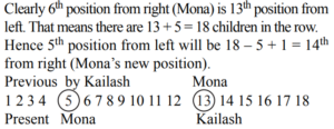 ORDER AND RANKING (General Mental Ability) UPSC EPFOTotal Questions: 3021. Among P, Q, T, A and B each having a different height, T is taller than P and B but shorter than A and Q. P is not the shortest. Who among them is the tallest?(a) A(b) Q(c) P(d) Data inadequateCorrect Answer: (d) Data inadequateSolution:T > P, B T < A, Q P > B A, Q > T > P > B So, either A or Q is the tallest.22. In a queue of children, Kailash is fifth from the left and Mona is sixth from the right. When they interchange their places among themselves, Kailash becomes thirteenth from the left. Now what will be Mona’s position from the right?(a) 4th(b) 14th(c) 8th(d) 15thCorrect Answer: (b) 14thSolution:23. In a column of girls Kamal is 11th from the front. Leela is 3 places ahead of Sunita who is 22nd from the front. How many girls are there between Kamal and Leela in the column?(a) Six(b) Eight(c) Seven(d) Cannot be determinedCorrect Answer: (b) EightSolution:24. The positions of the first and the fifth digits of the number 81943275 are interchanged. Similarly the positions of the second and the sixth digits are interchanged and so on till the fourth and the eighth digits. Which of the following will be the third digit from the right end after the rearrangement ?(a) 1(b) 9(c) 2(d) 4Correct Answer: (a) 1Solution:25. If all the alphabets of the series are written in reverse order, then which of the following will be 8th to the right of the 7th from the left end of the series?(a) A(b) B(c) C(d) DCorrect Answer: (b) BSolution:26. In a vertical row 13 persons are sitting. A is seventh from the beginning and two persons sits between G and A. Persons between A and L is same as persons between G and Q. Then what is the position of Q from the beginning?(a) Fourth(b) Eight(c) Sixth(d) Can’t be determinedCorrect Answer: (d) Can’t be determinedSolution:Can’t be determined.27. In a row of boys, Srinath is 7th from the left and Venkat is 12th from the right. If they interchange their positions, Srinath becomes 22nd from the left. How many boys are there in the row?(a) 19(b) 31(c) 33(d) 34Correct Answer: (c) 33Solution:28. There are 45 trees in a row. The lemon tree is 20th from right end. What is the rank of lemon tree from left end?(a) 26(b) 24(c) 25(d) 27Correct Answer: (a) 26Solution:Total No. of trees = 45 Position of lemon tree from the right end = 20 Rank of lemon tree from left end = (45 – 20) + 1 = 2629. In a row of 16 boys, when Prakash was shifted by two places towards the left, he became 7th from the left end. What was his earlier position from the right end of the row?(a) 7th(b) 8th(c) 9th(d) 10thCorrect Answer: (b) 8thSolution:Original position of Prakash from the left = 9th Position from the right end = 16 – 9 + 1 = 8th30. In a class Rajan got the 11th rank and he was 31st from the bottom of the list of boys passed. Three boys did not take the examination and one failed. What is the total strength of the class?(a) 32(b) 42(c) 45(d) 46Correct Answer: (c) 45Solution:Total number of boys passed = 11 + 31 – 1 = 41 Now, total number of boys = 41 + 3 + 1 = 45Submit Quiz« Previous123