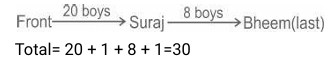 1. In a queue of boys, there are exactly 8 boys standing between Suraj and Bheem. Suraj is 21 st from the front, while Bheem is at the first position from the back. How many total boys are there in the queue [Group - D 25/08/2022 (Afternoon)]