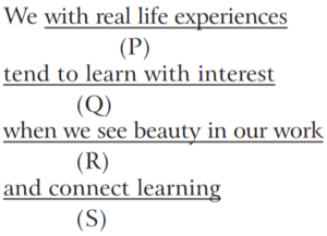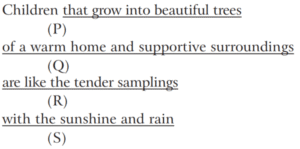 Ordering of Words in a Sentence (CDS-Solved Paper)Total Questions: 5031. The correct sequence should be [Morning Shift-2018 (I)](a) RQSP(b) QRPS(c) SPQR(d) QRSPCorrect Answer: (d) QRSPSolution:QRSP is the correct sequence.32. The correct sequence should be [Morning Shift-2019 (I)](a) SPRQ(b) RQPS(c) SPQR(d) QRPSCorrect Answer: (a) SPRQSolution:SPRQ is the correct sequence.33. The correct sequence should be [Morning Shift-2019 (I)](a) RQSP(b) QRPS(c) PSRQ(d) QPSRCorrect Answer: (d) QPSRSolution:QPSR is the correct sequence.34. The correct sequence should be [Morning Shift-2019 (I)](a) SPQR(b) SRPQ(c) PSRQ(d) QRSPCorrect Answer: (a) SPQRSolution:SPQR is the correct sequence.35. The correct sequence should be [Morning Shift-2019 (I)](a) SPQR(b) PRSQ(c) SPRQ(d) QRSPCorrect Answer: (a) SPQRSolution:SPQR is the correct sequence.36. The correct sequence should be [Morning Shift-2019 (I)](a) PSQR(b) QSRP(c) SPRQ(d) QSPRCorrect Answer: (b) QSRPSolution:QSRP is the correct sequence37. The correct sequence should be [Morning Shift-2018 (I)](a) QRPS(b) QSRP(c) SPRQ(d) PRSQCorrect Answer: (a) QRPSSolution:QRPS is the correct sequence.38. The correct sequence should be [Morning Shift-2019 (I)](a) QRPS(b) RSPQ(c) SPRQ(d) PRSQCorrect Answer: (b) RSPQSolution:RSPQ is the correct sequence.39. The correct sequence should be [Morning Shift-2019 (I)](a) QRPS(b) RPQS(c) RPSQ(d) PRSQCorrect Answer: (b) RPQSSolution:RPQS is the correct sequence.40. The correct sequence should be [Morning Shift-2019 (I)](a) QRSP(b) RPQS(c) SPRQ(d) PRSQCorrect Answer: (a) QRSPSolution:QRSP is the correct sequence.Submit Quiz« Previous12345Next »