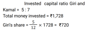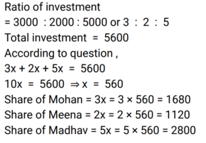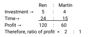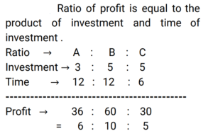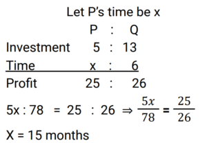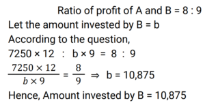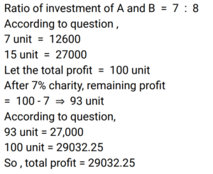 Partnership (Railway Maths) (Part – I)Total Questions: 2111. Ren and Martin started a company on 1 March 2019. The ratio of their investments was 5 : 4. Martin left the company after 15 months. In what ratio must the profit be divided at the end of 2 years? [Group D 22/09/2022 (Morning) ](a) 2 : 1(b) 29 : 19(c) 24 : 15(d) 1 : 3Correct Answer: (a) 2 : 1Solution:12. Giri and Kamal invested their capitals in a business in the ratio 5 : 7, respectively. If ₹1,728 was the total money invested in the business, what is Giri's share in the business ? [Group D 27/09/2022 (Afternoon) ](a) ₹702(b) ₹720(c) ₹1,008(d) ₹1,080Correct Answer: (b) ₹720Solution:13. A starts a business with ₹7,250 and after 3 months, B joins A as his partner. After a year since A started the business, the profit is divided between A and B in the ratio 8 : 9. What is B's contribution in the capital ? [Group D 06/10/2022 (Afternoon) ](a) ₹10,250(b) ₹10,500(c) ₹10,000(d) ₹10,875Correct Answer: (d) ₹10,875Solution:14. A and B invest in a business in the ratio of 7 : 8 for same time. If 7% of the total profit goes to charity and A's share in profit is ₹12,600, then what is the total amount of profit earned ? [Give your answer correct to 2 decimal places.] [Group D 11/10/2022 (Afternoon) ](a) ₹28,025.32(b) ₹28,032.25(c) ₹29,025.32(d) ₹29,032.25Correct Answer: (d) ₹29,032.25Solution:15. Mohan, Meena and Madhav enter into a partnership investing ₹3,000, ₹2,000 and ₹5,000 respectively. Find their respective shares in the annual profit of ₹5,600 in the given order of the names mentioned here. [Group D 11/10/2022 (Evening) ](a) ₹1,752, ₹1,168, ₹2,680(b) ₹1,680, ₹1,120, ₹2,800(c) ₹1,480, ₹1,320, ₹2,800(d) ₹1,680, ₹1,240, ₹2,680Correct Answer: (b) ₹1,680, ₹1,120, ₹2,800Solution:16. Three men entered into a business in partnership for 14 months, 8 months and 7 months. If the ratio of their profit is 5 : 7 : 8, what is the ratio of their investments? [RRB JE 23/05/2019 (Morning) ](a) 20 : 49 : 64(b) 5 : 4 : 4(c) 28 : 49 : 64(d) 5 : 7 : 8Correct Answer: (a) 20 : 49 : 64Solution:17. P and Q invested in a business in the ratio 5 : 13. Q withdrew his capital after 6 months. If they shared their profit in the ratio 25 : 26, for how long was P's amount used? [RRB JE 24/05/2019 (Evening) ](a) 15 months(b) 12 months(c) 18 months(d) 8 monthsCorrect Answer: (a) 15 monthsSolution:18. A and B invest some amount in the ratio 3 : 5 in a business. After 6 months, C joins them with an investment equal to that of B. In what ratio should the yearly profit be shared among A, B and C? [RRB JE 25/05/2019 (Afternoon) ](a) 3 : 5 : 6(b) 6 : 10 : 5(c) 6 : 7 : 5(d) 3 : 5 : 4Correct Answer: (b) 6 : 10 : 5Solution:19. P invests half as much as Q and Q puts in half as much as R in a business. If the monthly profit of Rs.7000 is shared between them, then what is the share of R? [RRB JE 29/05/2019 (Evening) ](a) Rs 2000(b) Rs 3000(c) Rs1000(d) Rs 4000Correct Answer: (d) Rs 4000Solution:20. Umar and Avinash started a partnership with investments of ₹ 10,000 and ₹ 15,000, respectively but due to a financial emergency the latter had to withdraw his investment after 8 months. In what ratio should the profit of the first twelve months be shared among [RRB ALP 09/08/2018 (Morning) ](a) 2 : 3(b) 1 : 1(c) 3 : 2(d) 1 : 2Correct Answer: (b) 1 : 1Solution:Required profit ratio = 10,000 × 12 : 15,000 × 8 = 30 : 30 = 1 : 1Submit Quiz« Previous123Next »