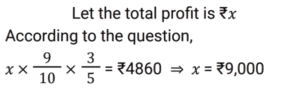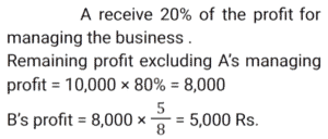 8. A is a working partner and B is a sleeping partner in a business. A invested ₹30,000 and B invested ₹50,000. A receives 20% of the profit for managing the business and the rest is divided in proportion to their capital. What does B get out of the profit of ₹10,000? [SSC CHSL 02/08/2023 (2nd Shift)]