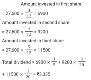 3. A lady invests ₹27,600 in three shares in the ratio 3 : 4 : 5 which pay dividends of 20%, 15% and 5% on her investment for that year, respectively. What is the total dividend ? [SSC MTS 04/09/2023 (1st Shift)]