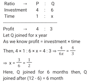 10. P invested Rs. 4000 for one year. Q joined him with an investment of Rs. 6000 after a few months. If at the end of one year the ratio of profits of P and Q is 4 : 3, then Q joined after how many months? [SSC CHSL 14/03/2023 (1st Shift)]