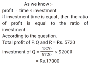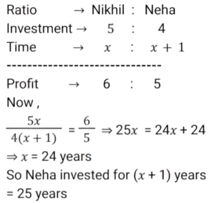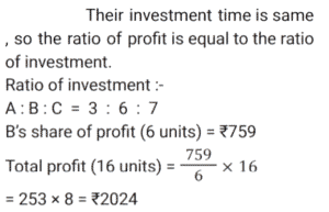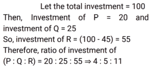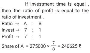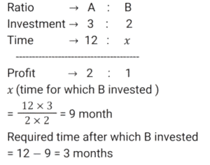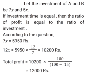 Partnership (SSC)Total Questions: 3721. A, B and C started a business by investing ₹9,000, ₹18,000 and ₹ 21,000, respectively. If B's share in the profit earned by them is ₹759, then the total profit earned by them together is: [SSC CHSL 10/08/2023 (3rd Shift)](a) ₹2,808(b) ₹2,024(c) ₹2,504(d) ₹2,208Correct Answer: (b) ₹2,024Solution:22. A and B invested money in a business in the ratio of 7 : 5. If 15% of the total profit goes for charity, and A's share in the profit is Rs.5,950, then what is the total profit? [SSC CGL 18/07/2023 (4th shift)](a) Rs.12,500(b) Rs.12,000(c) Rs.10,500(d) Rs.11,750Correct Answer: (b) Rs.12,000Solution:23. A starts a business with ₹45,000 and was joined afterwards by B with ₹30,000. When did B join if the profit at the end of the year was divided in the ratio 2 : 1 ? [Matriculation Level 30/06/2023 (Shift - 4)](a) After 6 months(b) After 12 months(c) After 3 months(d) After 9 monthsCorrect Answer: (c) After 3 monthsSolution:24. A and B jointly start a business. The investment of A is equal to seven times the investment of B. Find the share of A (in ₹) in the annual profit of ₹2,75,000. [SSC CHSL Tier II (26/06/2023)](a) 2,40,625(b) 2,45,625(c) 2,42,365(d) 2,41,225Correct Answer: (a) 2,40,625Solution:25. Rs.1200 are divided among X, Y and Z such that Y's share is Rs.200 more than X's share. Y's share is also Rs.200 less than Z's share. The share of Y is: [SSC MTS 12/05/2023 (Evening)](a) Rs.200(b) Rs.600(c) Rs.800(d) Rs.400Correct Answer: (d) Rs.400Solution:26. A and B started a business with Rs.15000 and Rs.30000 respectively. If A and B share profit in the ratio of 1: 5 respectively, then what is the ratio of the time period of investment for A and B respectively ? [SSC MTS 11/05/2023 (Afternoon)](a) 1 : 2(b) 2 : 5(c) 2 : 3(d) 2 : 7Correct Answer: (b) 2 : 5Solution: 27. Three partners P, Q and R invested a total of Rs. 52,000 in a business. At the end of the year, P got Rs. 1430, Q got Rs.1870 and R got Rs. 2420 as the share of profit. How much amount did Q invest in the business ? [SSC MTS 13/06/2023 (Evening)](a) Rs. 17000(b) Rs. 20400(c) Rs. 15300(d) Rs. 18700Correct Answer: (a) Rs. 17000Solution:28. P, Q and R are partners and invest in a business. P invests (1/5)th of the total investments and Q invests (1/4)th of thetotal investments. What is the ratio of investments of P, Q and R respectively? [SSC CHSL 13/03/2023 (1st Shift)](a) 4 : 8 : 11(b) 4 : 5 : 11(c) 4 : 7 : 11(d) 4 : 5 : 9Correct Answer: (b) 4 : 5 : 11Solution:29. X, Y and Z invested Rs.4,000, Rs.6,000 and Rs.8,000 respectively in a business. They invested the money for 3,2 and 4 years respectively. If the total profit is Rs.56,000, then what is the share of Y in the profit? [SSC CHSL 15/03/2023 (2nd Shift)](a) Rs.18,000(b) Rs.12,000(c) Rs.15,000(d) Rs.9,000Correct Answer: (b) Rs.12,000Solution:30. Nikhil and Neha invested capital in the ratio 5 : 4. The time Neha invested her money for was one year more than that invested by Nikhil. The ratio of their profits is in the ratio 6: 5. Find the time Neha invested the money for. [SSC CHSL 21/03/2023 (1st Shift)](a) 26 years(b) 23 years(c) 24 years(d) 25 yearsCorrect Answer: (d) 25 yearsSolution:Submit Quiz« Previous1234Next »