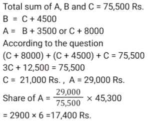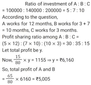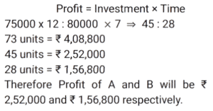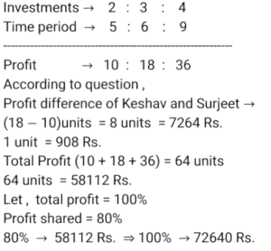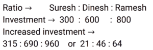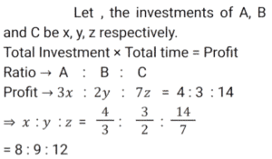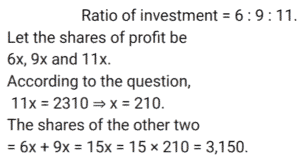 Partnership (SSC)Total Questions: 3731. A, B and C did certain investments and the ratio of their time periods is 3 : 2 : 7 respectively. Ratio of the profits of A, B and C is 4 : 3 : 14 respectively. What is the ratio of the investments of A, B and C ? [SSC CGL Tier II (02/03/2023)](a) 1 : 3 : 4(b) 7 : 9 : 11(c) 8 : 9 : 12(d) 2 : 3 : 11Correct Answer: (c) 8 : 9 : 12Solution:32. Suresh, Dinesh and Ramesh became partners in a business by investing money in the ratio of 3 : 6 : 8. If their investments are increased by 5%, 15% and 20%, respectively, then what will be the ratio of their profits for one year ? [SSC CGL Tier II (03/03/2023)](a) 7 : 46 : 64(b) 19 : 46 : 64(c) 21 : 46 : 64(d) 35 : 46 : 64Correct Answer: (c) 21 : 46 : 64Solution:33. A starts a business with ₹75,000 and B joins the business 5 months later with an investment of ₹80,000. After 1 year, they earn a profit of ₹4,08,800. Find the share of A and B (in ₹). [SSC CGL Tier II (07/03/2023)](a) 2,52,000 and 1,56,800(b) 2,50,000 and 1,58,800(c) 2,48,000 and 1,60,800(d) 2,49,500 and 1,59,300Correct Answer: (a) 2,52,000 and 1,56,800Solution:34. A, B and C started a business with the investment of ₹100000, ₹140000, ₹200000 respectively. After 3 months, C left the business, 7 months after C left the business, B also left the business. B and C took their investment with them. At the end of the year, C received his share of profit as ₹1155. What is the total share of profits of A and B ? [SSC CGL Tier II (08/08/2022)](a) ₹6150(b) ₹5005(c) ₹4995(d) ₹5555Correct Answer: (b) ₹5005Solution:35. The profit earned by a company is to be divided among three friends who invested their money in the company, in the proportion of 6 : 9 : 11. If the share of the person who invested the most is ₹2,310, then what is the sum of the money (in ₹) received by the other two friends? [SSC MTS 22/10/2021(Morning)](a) 1,890(b) 3,150(c) 5,460(d) 1,260Correct Answer: (b) 3,150Solution:36. Keshav, Surjeet and Thomas started a business with investments in the ratio 2 : 3 : 4. The ratio of their period of investments is 5 : 6 : 9. Twenty percent of the profit was spent on rent and maintenance of the office. Remaining profit was distributed among themselves. If the difference in the share of profit of Keshav and Surjeet is Rs.7264 then how much is the total profit (in Rs.)? [SSC CGL 18/08/2021(Evening)](a) 51060(b) 58112(c) 46490(d) 72640Correct Answer: (d) 72640Solution:37. A, B, C subscribe a sum of Rs.75,500 for a business. A subscribes Rs.3,500 more than B, and B subscribes Rs. 4,500 more than C. Out of a total profit of Rs.45,300 how much (in Rs.) does A receive ? [SSC CPO 25/11/2020 (Evening shift)](a) 12,600(b) 15,000(c) 17,400(d) 14,700Correct Answer: (c) 17,400Solution:Submit Quiz« Previous1234