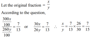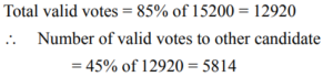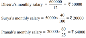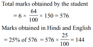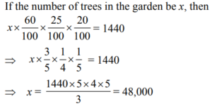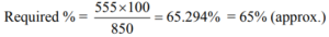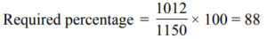 PERCENTAGE (QUANTITATIVE APTITUDE) EPFO UPSCTotal Questions: 3011. In an examination Nisha scores a total of 555 marks out of 850. What is her approximate percentage in the examination?(d) 65(a) 59(b) 72(c) 68Correct Answer: (d) 65Solution:12. A student scores 64% marks in 6 papers of 150 marks each. He scores 25% of his total obtained marks in Hindi and English together. How much is his total score for both these papers?(d) 144(a) 120(b) 124(c) 140Correct Answer: (d) 144Solution:13. Sumit obtained a total of 1012 marks out of 1150 in an examination. What is his percentage in the examination?(a) 86(b) 88(c) 84(d) 90Correct Answer: (b) 88Solution:14. The population of a town is 198000. It increases by 7% in the 1st year and decreases by 5% in the 2nd year. What is the population of the town at the end of 2 years?(a) 211860(b) 201267(c) 222453(d) 198900Correct Answer: (b) 201267Solution:15. If the numerator of a fraction is increased by 200% and the denominator is increased by 160%, the resultant fraction is 7/13. What is the original fraction?(a) 7/15 (b) 2/5 (c) 8/15 (d) 5/7Correct Answer: (a) 7/15 Solution:16. Bovina spent ₹ 44,668 on her air tickets, ₹ 56,732 on buying gifts for the family members and the remaining 22% of the total amount she had as cash with her. What was the total amount?(a) ₹ 28,600 (b) ₹ 1,30,000(c) ₹ 1,01,400 (d) ₹ 33,800Correct Answer: (b) ₹ 1,30,000Solution:17. In a college election between two candidates, one candidate got 55% of the total valid votes. 15% of the votes were invalid. If the total votes were 15,200, what is the number of valid votes the other candidate got ?(a) 7106(b) 6840(c) 8360(d) 5814Correct Answer: (d) 5814Solution:18. The red blood cells in a blood sample grows by 10% per hour in first two hours, decreases by 10% in next one hour, remains constant in next one hour and again increases by 5% per hour in next two hours. If the original count of the red blood cells in the sample is 40000, find the approximate red blood cell count at the end of 6 hours.(a) 40000(b) 45025(c) 48025(d) 50025Correct Answer: (c) 48025Solution:19. Twenty five percent of Pranab’s annual salary is equal to eighty percent of Surya’s annual salary. Surya’s monthly salary is forty percent of Dheeru’s monthly salary. If Dheeru’s annual salary is ₹ 6 lacs, what is Pranab’s monthly salary ? (At some places annual income and in some place monthly income is given.)(a) ₹ 7.68 lacs (b) ₹ 56,000(c) ₹ 8.4 lacs (d) ₹ 64,000Correct Answer: (d) ₹ 64,000Solution:20. In a big garden 60% of the trees are coconut trees, 25% of the number of coconut trees are mango trees and 20% of the number of mango trees are apple trees. If the number of apple trees in the garden is 1440. Then find the number of trees in the garden is:(a) 48000 (b) 50000(c) 51000 (d) 45000Correct Answer: (a) 48000 Solution:Submit Quiz« Previous123Next »