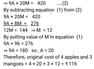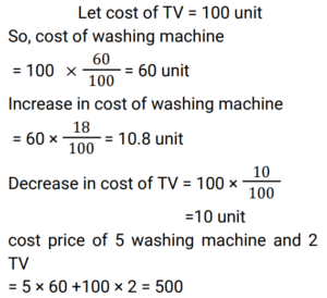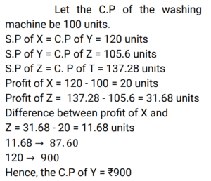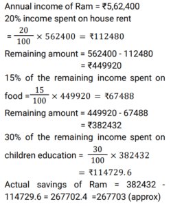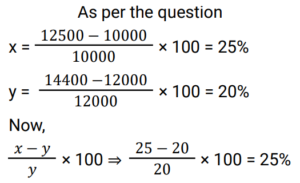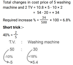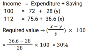 Percentage (Railway Maths) (Part – I)Total Questions: 501. A student scored 80/80 marks in term 1 and 75/90 marks in term 2. What will be his percentage of final score, if the weightage given to the terms is 40% and 60%, respectively. (correct to the nearest integer) [Group D 22/08/2022 (Morning) ](a) 90%(b) 95%(c) 70%(d) 85%Correct Answer: (a) 90%Solution:2. Ramu used to spend 72% of his income. His income has increased by 12% and he has increased his expenditure by 5%. If Ramu earlier saved ₹y and after the increase he now saves ₹x, then what is the value of (x - y/y × 100) %? [Group D 30/08/2022 (Morning) ](a) 22%(b) 27%(c) 25%(d) 30%Correct Answer: (d) 30%Solution:3. The annual income of Ram is ₹ 5,62,400. He spent 20% of this income on house rent, 15% of the remaining income on food, and 30% of the income still remaining with him on children's education. If the amount still remaining was his savings, which of the following amounts is closest to his actual savings? [Group D 02/09/2022 (Evening)](a) ₹ 2,67,037(b) ₹ 2,76,703(c) ₹ 2,67,703(d) ₹ 2,67,730Correct Answer: (c) ₹ 2,67,703Solution:4. Sujata buys 9 apples and 8 mangoes for ₹276. When the cost of an apple is decreased by 10% and that of a mango remains the same, then the cost of 5 apples and 10 mangoes is ₹210. What is the original cost of 4 apples and 3 mangoes? [Group D 05/09/2022 (Evening)](a) 116(b) 123(c) 120(d) 108Correct Answer: (a) 116Solution:5. Last year, Ganga's monthly salary was ₹12,000, and Saraswati's monthly salary was ₹10,000. This year, Ganga's monthly salary is ₹14,400, while Saraswati's monthly salary is ₹12,500. If the percentage increase in monthly salary of Saraswati this year as compared to last year's monthly salary is denoted by x%, and the percentage increase in monthly salary of Ganga this year as compared to last year's monthly salary is denoted by y%, then find the value of ((x − y) / y × 100) %. [Group D 06/09/2022 (Evening)](a) 25%(b) 24%(c) 20%(d) 22%Correct Answer: (a) 25%Solution:6. The cost of a washing machine is 40% less than the cost of a TV. If the cost of the washing machine increases by 18% and that of the TV decreases by 10%, then what is the change in the total cost of 5 washing machines and 2 TVs? [Group D 09/09/2022 (Afternoon)](a) Decreases by 6.5%(b) Decreases by 6.4%(c) Increases by 6.5%(d) Increases by 6.8%Correct Answer: (d) Increases by 6.8%Solution:7. Mridul's working hours per day increased by 25% and his hourly wages increased by 20%. By how much percent did his daily earnings increase? [Group D 20/09/2022 (Afternoon)](a) 30%(b) 46%(c) 50%(d) 40%Correct Answer: (c) 50%Solution:8. Due to decrease in manpower, the production in a factory decreases by 30%. By what percent should the working hours be increased to restore the original production ? [Group D 22/09/2022 (Afternoon) ](a)(b)(c)(d)Correct Answer: (b)Solution:9. X sells a washing machine to Y at a profit of 20%. Y sells it to Z at a loss of 12% and later Z sells it to T at a profit of 30%. If Z earns ₹87.60 more than X as profit, then at what price (in₹) did Y buy the washing machine ? [Group D 26/09/2022 (Morning) ](a) 960(b) 1,020(c) 900(d) 980Correct Answer: (c) 900Solution:10. In a Lions Club, 70% of the members are young and 30% of the members are old. The average age of the old members is 40 years and that of the young members is 20 years. What is the average age of all the members (in years) ? [Group D 30/09/2022 (Evening) ](a) 26(b) 22(c) 28(d) 24Correct Answer: (a) 26Solution:Submit Quiz12345Next »