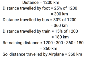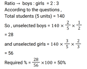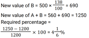 Percentage (Railway Maths) (Part – I)Total Questions: 5011. The sum of two numbers is 205. If one of these numbers is reduced by 5% and the other is increased by 10%, the resulting numbers are equal to each other. Find the smaller of the two initial numbers. [Group D 06/10/2022 (Morning) ](a) 95(b) 100(c) 105(d) 110Correct Answer: (a) 95Solution:12. If the length l of a room is reduced by 10% and breadth b is increased by 10%, then find the positive change in its perimeter. [Group D 11/10/2022 (Evening)](a) (l − b) / 5(b) 2 / 5 (l + b)(c) 2 / 5 (l − b)(d) (l + b) / 5Correct Answer: (a) (l − b) / 5Solution:13. Ravi has to go from Hyderabad to Delhi. The distance between Hyderabad and Delhi is 1,200 kms. He decides to travel 25% of the distance on foot , 30% of the distance by bus,and 15% of the distance by train and remaining distance by an airplane. What is the distance travelled by Ravi by an Airplane? [NTPC CBT II Level 5 (12/06/2022) Shift 1 ](a) 300 km(b) 360 km(c) 580 km(d) 425 kmCorrect Answer: (b) 360 kmSolution:14. A and B are numbers such that A is 40% larger than B. If A is decreased by 20% and B is increased by 38% then what is the percentage increase in the total value of A and B? [NTPC CBT II Level 2 (13/06/2022) Shift 1 ](a)(b)(c)(d)Correct Answer: (b)Solution:15. The marks obtained by A in a test are 20% more than the marks obtained by B and C obtained 85% of the total marks obtained by A and B. By what percentage are the marks obtained by A less than the marks obtained by C ? (Correct to one decimal place) [NTPC CBT II Level 3 (14/06/2022) Shift 2 ](a) 35.8%(b) 34.6%(c) 55.8%(d) 37.2%Correct Answer: (a) 35.8%Solution:16. Total number of students in class X is 140 and the ratio of boys to girls is 2 : 3. If 50% of the boys and 33.33% of the girls are selected for competition in school, then find the percentage of unselected boys to unselected girls? [NTPC CBT II Level 5 (15/06/2022) Shift 3](a) 50%(b) 28%(c) 56%(d) 66.66%Correct Answer: (a) 50%Solution:17. In measuring the sides of a rectangle error of 10% and 8% in excess are made. Find the error percent in its area. [NTPC CBT II Level 2 (16/06/2022) Shift 2](a) 1.88%(b) 188%(c) 18.8%(d) 0.188%Correct Answer: (c) 18.8%Solution:18. What is to be added to 12% of 2400, so that the sum will be equal to 18% of 5400? [NTPC CBT I 28/12/2020 (Morning)](a) 952(b) 972(c) 684(d) 288Correct Answer: (c) 684Solution:19. In an examination, 55% candidates passed in English, 35% candidates passed in Mathematics and 20% candidates passed in both the subjects. If the total number of failed candidates in both the subjects is 1200, then find how many candidates took the exam. [NTPC CBT I 29/12/2020 (Morning)](a) 2800(b) 1200(c) 4000(d) 3000Correct Answer: (c) 4000Solution:20. In an examination, 41% of students failed in Economics, 35% of students failed in Geography and 39% of students failed in History. 5% of the students failed in all the three subjects, 14% of students failed in Economics and Geography, 21% of the students failed in Geography and History and 18% of students failed in History and Economics. Find the percentage of students who failed in only Economics. [NTPC CBT I 08/01/2021 (Morning)](a) 10%(b) 14%(c) 16%(d) 12%Correct Answer: (b) 14%Solution:Submit Quiz« Previous12345Next »