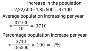 Percentage (Railway Maths) (Part – V)Total Questions: 501. If 15% of (x - y) = 9% of (x + y), then y is what percentage of x? [RRB NTPC 11/03/2021 (Evening) ](a) 25%(b) 300%(c) 400%(d) 150%Correct Answer: (a) 25%Solution:2. Two numbers are respectively 30% and 80% more than a third number. These two numbers are in the ratio of. [RRB NTPC 12/03/2021 (Morning) ](a) 8 : 13(b) 13 : 18(c) 3 : 8(d) 7 : 2Correct Answer: (b) 13 : 18Solution:Let the 3rd number = 100 1st number = 130 2nd number = 180 Ratio = 130 : 180 = 13 : 183. If A is 125% of B, then B is what percentage of (A - B) ? [RRB NTPC 12/03/2021 (Morning) ](a) 200%(b) 300%(c) 150%(d) 400%Correct Answer: (d) 400%Solution:4. Find the approximate percentage of aggregate marks scored by Ramesh, who obtained 50%, 60% and 70% marks in three examinations with maximum marks 100, 130 and 150 respectively. [RRB NTPC 12/03/2021 (Evening)](a) 61.32(b) 71.23(c) 55.5(d) 70.1Correct Answer: (a) 61.32Solution:5. In a town, the population increased from 1,85,500 to 2,22,600 in a decade. The average percentage increase of population per year is: [RRB NTPC 13/03/2021 (Morning)](a) 3%(b) 9%(c) 5%(d) 2%Correct Answer: (d) 2%Solution:6. Ravi’s salary is 20% more than Mohan’s salary. If Mohan’s salary is Rs. 1,600 then Ravi’s salary will be: [RRB NTPC 13/03/2021 (Evening)](a) 1,890(b) 1,920(c) 1,750(d) 1,800Correct Answer: (b) 1,920Solution:Ravi’s salary = 1,600 × 120/100 = 1,9207. The sum of the salaries of A and B together is Rs. 4300. A spends 95% of his salary and B, 80% of his salary. If their savings are the same, what is A’s salary? [RRB NTPC 14/03/2021 (Morning)](a) 3440(b) 3430(c) 3445(d) 3442Correct Answer: (a) 3440Solution:8. In a class, the ratio of girls and boys is 13 : 12. Find the percentage of the girls in the class. [RRB NTPC 14/03/2021 (Morning)](a) 48%(b) 52%(c) 25%(d) 13%Correct Answer: (b) 52%Solution:9. If the radius of a circle is reduced by 15%, then its area is reduced by. [RRB NTPC 14/03/2021 (Evening) ](a) 17.75%(b) 12.75%(c) 17%(d) 27.75%Correct Answer: (d) 27.75%Solution:10. 82% of the number is 738. What is 90% of that number? [RRB NTPC 15/03/2021 (Morning) ](a) 802(b) 900(c) 820(d) 810Correct Answer: (d) 810Solution:Submit Quiz12345Next »