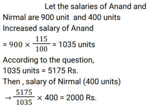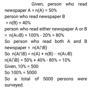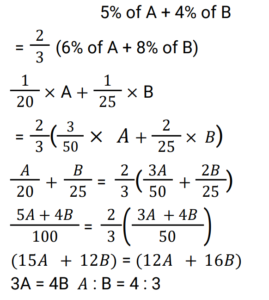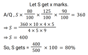 Percentage (Railway Maths) (Part – V)Total Questions: 5031. P gets 360 marks out of a total score of 500. Marks of P are 10% less than Q's score. Q got 25% more than R, and R got 20% less than S. What is the percentage marks of S ? [RRB JE 23/05/2019 (Afternoon) ](a) 72%(b) 68%(c) 75%(d) 80%Correct Answer: (d) 80%Solution:32. If (25/8) % of 128 = x , find the value of 'x'. [RRB JE 23/05/2019 (Evening) ](a) 4(b) 12(c) 8(d) 3Correct Answer: (a) 4Solution:33. In a survey conducted in a locality, It was found that 50% read newspaper A, 40% read newspaper B, and 20 % read neither A nor B. If the number of persons who read both A and B is 500, then how many persons were surveyed? [RRB JE 24/05/2019 (Evening) ](a) 7000(b) 3000(c) 5000(d) 4500Correct Answer: (c) 5000Solution:34. When the number 42 is misread as 24, what is the percentage error? [RRB JE 25/05/2019 (Afternoon)](a) 18%(b) 42.86%(c) 55.34%(d) 28%Correct Answer: (b) 42.86%Solution:35. The length of a rectangle is halved, and its breadth is tripled. What is the percentage change in its area? [RRB JE 26/05/2019 (Morning)](a) 75% decrease(b) 25% increase(c) 50% decrease(d) 50% increaseCorrect Answer: (d) 50% increaseSolution:36. What is the percentage form of the ratio 1 : 8? [RRB JE 28/05/2019 (Afternoon)](a) 80%(b) 6.25%(c) 12.5%(d) 8%Correct Answer: (c) 12.5%Solution:1/8 × 100 = 12.5 %37. If 5/8 = x%, what is the value of x? [RRB JE 28/05/2019 (Afternoon)](a) 62.5(b) 65.7(c) 67.5(d) 40Correct Answer: (a) 62.5Solution:5/8 = x/100 ⇒ x = 62.5 %38. The salaries of Anand and Nirmal are in the ratio of 9 : 4. When Anand's salary is increased by 15%, it becomes Rs. 5175. What is the salary of Nirmal? [RRB JE 29/05/2019 (Afternoon)](a) Rs. 2000(b) Rs. 4000(c) Rs. 5000(d) Rs. 4500Correct Answer: (a) Rs. 2000Solution:39. Arun's income is 150% of Bala's income. Income of Chandru is 120% of the income of Arun. If the total income of Arun, Bala and Chandru is Rs. 86000, then what is the income of Chandru? [RRB JE 30/05/2019 (Morning)](a) Rs. 36000(b) Rs. 32000(c) Rs. 30000(d) Rs. 34000Correct Answer: (a) Rs. 36000Solution:40. If 5% of A + 4% of B = 2/3 (6 % of A + B % of B), then what is A : B? [RRB JE 30/05/2019 (Evening) ](a) 1 : 1(b) 4 : 3(c) 1 : 2(d) 5 : 4Correct Answer: (b) 4 : 3Solution:Submit Quiz« Previous12345Next »