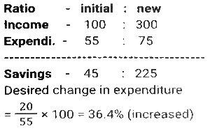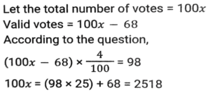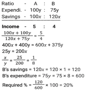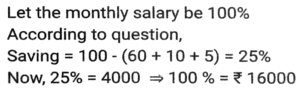 Percentage SSC-Maths (Part-3)Total Questions: 5041. A person spends 60% of his salary on family expenses, 10% on medical expenses, 5% on charity, and saves the remaining amount. If the amount on savings is ₹4,000, find his monthly salary. [SSC CHSL 05/07/2024 (4th Shift)](a) ₹12,000(b) ₹15,000(c) ₹14,000(d) ₹16,000Correct Answer: (d) ₹16,000Solution:42. If the price of rice is reduced by 24%, it enables Alok to buy 10 kg more rice for ₹2,500. The reduced rate of rice per kg is: [SSC CHSL 08/07/2024 (1st Shift)](a) ₹25(b) ₹60(c) ₹50(d) ₹75Correct Answer: (b) ₹60Solution:43. An interval of 2 hours 25 minutes is wrongly estimated by 2 hours 30.5 minutes. The error percentage is : [SSC CHSL 08/07/2024 (1st Shift)](a) 3²³⁄₂₉ %(b) 2²⁷⁄₂₉ %(c) 3¹⁹⁄₂₉ %(d) 2²¹⁄₂₉ %Correct Answer: (a) 3²³⁄₂₉ %Solution:44. Suresh studies the patiern of daily sale of a shop. He finds that on Monday, the sale was decreased by 10% in comparison to the sale on Sunday. On Tuesday, the sale was increased by 10% in comparison to the sale of Monday. If the sale on Tuesday was of ₹1,485, how much was the sale on Sunday? [SSC CHSL 08/07/2024 (2nd Shift)](a) ₹1,495(b) ₹1,485(c) ₹1,475(d) ₹1,500Correct Answer: (d) ₹1,500Solution:45. A's income is equal to 125% of the income of B, while B's savings are 120% of the savings of A. If the expenditure of B is 75% of the expenditure of A, then how much are B's savings as a percentage of her expenditure? [SSC CHSL 08/07/2024 (2nd Shift)](a) 20%(b) 22½ %(c) 16⅔ %Correct Answer: (a) 20%Solution:46. At an election involving two candidates, 68 votes are declared invalid. The winning candidate gets 52% of the valid votes and wins by 98 votes. The total number of votes polled is: [SSC CHSL 08/07/2024 (3rd Shift)](a) 2518(b) 2475(c) 2500(d) 2250Correct Answer: (a) 2518Solution:47. Ramesh's pocket money was reduced by 25%, and then the reduced pocket money was increased by 20%. Find the net increase or decrease percentage in his original pocket money. [SSC CHSL 08/07/2024 (3rd Shift)](a) Increase 12%(b) Decrease 12%(c) Increase 10%(d) Decrease 10%Correct Answer: (d) Decrease 10%Solution:48. In an election a candidate secured 47% of the votes and lost to his only opponent by 276 votes. Find the total number of votes polled. [SSC CHSL 08/07/2024 (3rd Shift)](a) 3800(b) 4600(c) 4000(d) 4200Correct Answer: (b) 4600Solution:49. In an election contested by two candidates, one candidate got 42% of the total votes and still lost by 800 votes. Find the total number of votes that were cast. [SSC CHSL 08/07/2024 (4th Shift)](a) 7000(b) 8000(c) 2000(d) 5000Correct Answer: (d) 5000Solution:50. A person saves 45% of his income. Next year, his income increases by 200%. He increases his savings by five times the previous year's savings. By what percentage (correct to one place of decimal) has he increased/decreased his expenditure? [SSC CHSL 09/07/2024 (1st Shift)](a) Increased, 63.4%(b) Increased, 36.4%(c) Decreased, 63.4%(d) Decreased, 36.4%Correct Answer: (b) Increased, 36.4%Solution:Submit Quiz« Previous12345