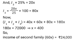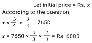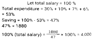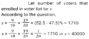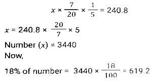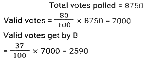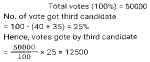 Percentage SSC-Maths (Part-4)Total Questions: 501. In an election between two candidates, 10% of the voters did not cast their votes and 5% of the votes polled were found invalid. The successful candidate got 52.5% of the valid votes and won by a majority of 1710 votes. The number of voters enrolled on the voters list was: [SSC CHSL 09/07/2024 (1st Shift)](a) 42000(b) 48000(c) 36000(d) 40000Correct Answer: (d) 40000Solution:2. The total income of three families is ₹72,000. Their expenditures are 80%, 85% and 75%, respectively. If the savings are in the ratio 8 : 9 : 20, then the income of the second family is : [SSC CHSL 09/07/2024 (2nd Shift)](a) ₹40,000(b) ₹32,000(c) ₹24,000(d) ₹16,000Correct Answer: (c) ₹24,000Solution:3. A number is first decreased by 18% and the resulting number is then increased by 25%. What is the overall percentage change in the original number? [SSC CHSL 09/07/2024 (2nd Shift)](a) Decrease by 3.5%(b) Increase by 2.5%(c) Decrease by 2.5%(d) Increase by 3.5%Correct Answer: (b) Increase by 2.5%Solution:4. The average marks scored by the students of a class is 75. If the average marks scored by the girls in the same class is 90 and that of boys is 70, what is the percentage of boys in the class? [SSC CHSL 09/07/2024 (3rd Shift)](a) 60%(b) 70%(c) 65%(d) 75%Correct Answer: (d) 75%Solution:5. In an election there were only two candidates. One of the candidates secured 35% of votes and is defeated by the other candidate by 381 votes. The total number of votes polled is: [SSC CHSL 09/07/2024 (3rd Shift)](a) 1028(b) 1270(c) 635(d) 514Correct Answer: (b) 1270Solution:6. If 20% of 35% of a number is 240.8, then 18% of that number (rounded off to 1 decimal place) is: [SSC CHSL 09/07/2024 (4th Shift)](a) 621.2(b) 619.2(c) 618.2(d) 623.2Correct Answer: (b) 619.2Solution:7. The price of an electronic watch is first reduced by 25% and then increased by 50%. If the resulting price of the electronic watch is ₹7,650, then what was its original price (in ₹)? [SSC CHSL 09/07/2024 (4th Shift)](a) 6,600(b) 6,800(c) 6,900(d) 6,500Correct Answer: (b) 6,800Solution:8. Ram spends 30% of his salary on food, 10% on house rent, 7% on entertainment, and 6% on conveyance. If at the end of a month his savings are 1,880, then his monthly salary is : [SSC CHSL 10/07/2024 (1st Shift)](a) ₹4,000(b) ₹4,500(c) ₹5,000(d) ₹5,500Correct Answer: (a) ₹4,000Solution:9. In an election between two candidates, A gets 63% of the total valid votes. If the total votes polled were 8,750, what is the number of valid votes that the other candidate B gets, if 20% of the total votes were declared invalid? [SSC CHSL 10/07/2024 (1st Shift)](a) 4,410(b) 3,560(c) 6,450(d) 2,590Correct Answer: (d) 2,590Solution:10. In an election there were three candidates. The first candidate got 40% votes and second candidate got 35% votes. If the total votes in the election are 50,000, find the number of votes got by the third candidate. [SSC CHSL 10/07/2024 (2nd Shift)](a) 13,500(b) 12500(c) 12000(d) 1250Correct Answer: (b) 12500Solution:Submit Quiz12345Next »