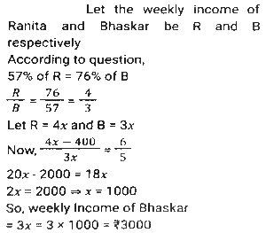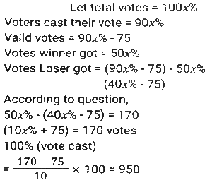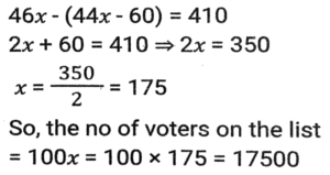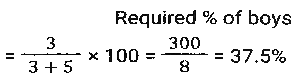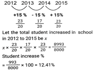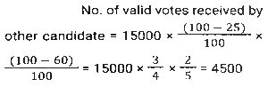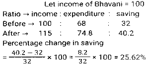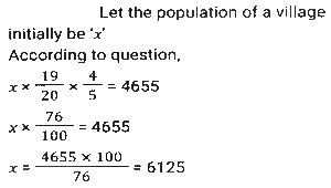 Percentage SSC-Maths (Part-4)Total Questions: 5021. If the price of a commodity is increased by 36%, by what percentage (rounded off to 1 decimal place) should its consumption be decreased so that the expenditure of the commodity stays the same? [SSC CHSL 11/07/2024 (4th Shift)](a) 29.5%(b) 26.5%(c) 36%(d) 32%Correct Answer: (b) 26.5%Solution:22. 57% of Ranita's weekly income is equal to 76% of Bhaskar's weekly income. If Ranita's weekly income was reduced by ₹400, while Bhaskar's weekly income did not change, the ratio of the weekly incomes of Ranita and Bhaskar, respectively, would have been 6:5. What is Bhaskar's weekly income (in ₹) ? [SSC CPO 27/06/2024 (1st Shift)](a) 2800(b) 4000(c) 3000(d) 3200Correct Answer: (c) 3000Solution:23. In an election between two candidates, one got 60% of the total valid votes. 25% of the votes were invalid. If the total number of votes was 15,000, then find the number of valid votes that the other candidate got. [SSC CPO 27/06/2024 (1st Shift)](a) 5,550(b) 4,500(c) 6,750(d) 5,000Correct Answer: (b) 4,500Solution:24. On account of corona virus, 5% of the population of a village died. Out of the remaining population, 20% fled due to panic. If the present population is 4655, then what was the population of the village before the corona attack? [SSC CPO 27/06/2024 (2nd Shift)](a) 5995(b) 6125(c) 6000(d) 5985Correct Answer: (b) 6125Solution:25. In a class, the numbers of boys and girls are in the ratio of 3:5. What is the percentage of boys in the class? [SSC CPO 27/06/2024 (2nd Shift)](a) 37.5%(b) 60%(c) 42.5%(d) 12.5%Correct Answer: (a) 37.5%Solution:26. In an election, the winner was supported by 46% of all the voters in the list, and he got 410 votes more than his only rival. 10% of the voters on the voters' list did not cast their votes, and 60 voters cast their ballot papers blank. How many voters were on the list? [SSC CPO 27/06/2024 (2nd Shift)](a) 17445(b) 16550(c) 17500(d) 15750Correct Answer: (c) 17500Solution:27. The strength of a school increases and decreases every alternate year by 15%. If it started with an increase in 2012, then the strength of the school in the beginning of 2015, as compared to that in 2012, had (correct to two decimal places): [SSC CPO 27/06/2024 (2nd Shift)](a) Decreased by 12.41%(b) Increased by 12.41%(c) Decreased by 13.85%(d) Increased by 13.85%Correct Answer: (b) Increased by 12.41%Solution:28. The population of a town increases 8% annually. If its present population is 1,42,560, what was the population one year ago? [SSC CPO 27/06/2024 (3rd Shift)](a) 1,34,000(b) 1,33,000(c) 1,32,000(d) 1,31,000Correct Answer: (c) 1,32,000Solution:29. In an election between two candidates, 10% of the voters did not cast their votes and 75 votes were found invalid. The winner got 50% of the total votes expected and won by 170 votes. How many voters were enrolled in the voters' list? [SSC CPO 27/06/2024 (3rd Shift)](a) 800(b) 855(c) 850(d) 950Correct Answer: (d) 950Solution:30. Bhavani spends 68% of her income. Her income increases by 15% and her expenditure increases by 10%. How much is the increase in the percentage of saving? (Use decimal up to 2 digits) [SSC CPO 28/06/2024 (1st Shift)](a) 20.57%(b) 25.62%(c) 28.42%(d) 24.80%Correct Answer: (b) 25.62%Solution:Submit Quiz« Previous12345Next »
