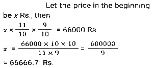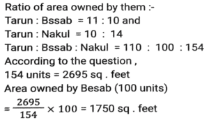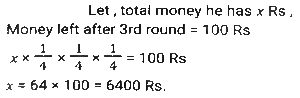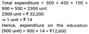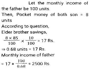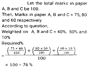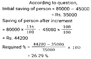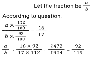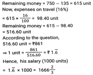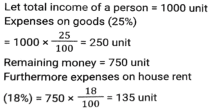 Percentage SSC-Maths (Part-6)Total Questions: 5011. A person spends 25% of his income on goods of daily uses. Furthermore, he spends 18% of the rest on house rent and 16% of the rest on travel. After that, only ₹861 is left with him. What is his salary? [SSC CGL 24/07/2023 (3rd shift)](a) 1852⅓(b) 1666⅔(c) 1563⅓(d) 1426⅓Correct Answer: (b) 1666⅔Solution:12. In an examination a candidate had to sit for three papers A, B, and C. The candidate secured 75% marks in Paper A, 80% marks in Paper B, and 60% marks in Paper C. If the weightage assigned to Papers A, B, and C were 40%, 50% and 10%, respectively, then find the weighted percentage of marks obtained by the candidate, when all the three papers were taken together. [SSC CGL 24/07/2023 (4th shift)](a) 77%(b) 74%(c) 72%(d) 76%Correct Answer: (d) 76%Solution:13. Out of the total toffees, 1/10 are wasted. 35% of the rest are given to S and 1/8 of the total are given to N. If the toffees with N are 10 more than the wasted toffees, then how many toffees were given to S? [SSC CGL 25/07/2023 (1st shift)](a) 126(b) 150(c) 110(d) 135Correct Answer: (a) 126Solution:14. A family income is ₹35,000 in a month. The family spends the income on various expenditures, viz., food, health, education, entertainment, and rent. After incurring all the expenditures, 8% is saved every month. The expenditure on health is 50% more than that of food. While food is three times of the expenditure on entertainment, the expenditure on health is half of the expenditure on education. The expenditure on rent is one-third of the combined expenditure on food, health and education. How much expenditure (in) is incurred on education? [SSC CGL 25/07/2023 (2nd shift)](a) 12600(b) 8400(c) 13200(d) 7700Correct Answer: (a) 12600Solution:15. Tarun owned a plot of land having an area that was 10% more than the area of the plot owned by Basab, while the area of the plot of land owned by Nakul was 40% more than the area of the plot owned by Tarun. If the area of the plot owned by Nakul was 2695 square feet, what was the area (in square feet) of the plot owned by Basab? [SSC CGL 25/07/2023 (4th shift)](a) 1750(b) 1740(c) 1780(d) 1800Correct Answer: (a) 1750Solution:16. A father gives 8% of his monthly income to both his sons as pocket money. The elder son gets 85% of the total amount given to both the sons. He spend 90% of the amount and saves ₹17. What is the monthly income of father? [SSC CGL 26/07/2023 (3rd shift)](a) ₹ 5,000(b) ₹ 4,500(c) ₹3,500(d) ₹2,500Correct Answer: (d) ₹2,500Solution:17. During the previous year, the price of an electronic item increased by 10%, and this year, the price of the same item decreased by 10%. If the price of the electronic item at present is ₹66,000, then what was the price of the discussed electronic item in the beginning of the previous year? (Rounded off to one decimal place) [Graduate Level 28/06/2023 (Shift-3)](a) ₹91,262.5(b) ₹72,432.4(c) ₹66,666.7(d) ₹ 82,345.4Correct Answer: (c) ₹66,666.7Solution:18. If the numerator of a fraction is increased by 12% and its denominator is reduced by 8%, it gives a new fraction 16/17. What is the original fraction? [Higher Secondary 27/06/2023 (Shift-3)](a) 92/119(b) 23/28(c) 28/23(d) 119/92Correct Answer: (a) 92/119Solution:19. The monthly income of a person was Rs.80,000 and his monthly expenditure was Rs.45,000. Next year, his income increased by 16% and his expenditure increased by 8%. Find the percentage increase in his savings (correct to 2 decimal places). [Higher Secondary 30/06/2023 (Shift-2)](a) 25.35%(b) 26.29%(c) 30.25%(d) 44.36%Correct Answer: (b) 26.29%Solution:20. While playing cards, a man loses 75% of his money in the first round, 75% of the remaining in the second round, and 75% of the remaining in the third round. If he is left with Rs. 100, how much money does he have initially? [Matriculation Level 27/06/2023 (Shift-2)](a) Rs.6,400(b) Rs.2,400(c) Rs.1,600(d) Rs.3,200Correct Answer: (a) Rs.6,400Solution:Submit Quiz« Previous12345Next »