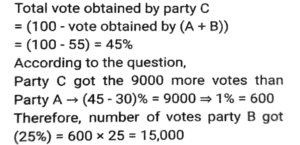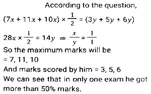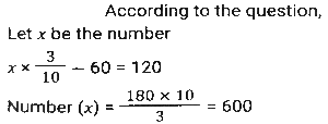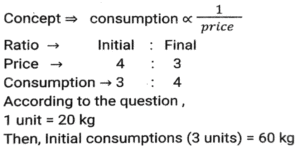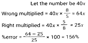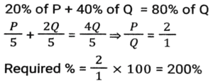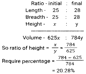 Percentage SSC-Maths (Part-6)Total Questions: 5031. If both length and breadth of a cuboid is increased by 12 percent, then by how much percent its height should be reduced so that the volume of the cuboid remains same? [SSC MTS 16/05/2023 (Afternoon)](a) 14.56 percent(b) 24.72 percent(c) 20.28 percent(d) 28.44 percentCorrect Answer: (c) 20.28 percentSolution:32. If the price of onion increases from Rs. 60/kg to Rs. 75/kg, then by what percentage a household should decrease the consumption of onion so that expenditure remains same? [SSC MTS 19/05/2023 (Evening)](a) 40%(b) 25%(c) 20%(d) 30%Correct Answer: (c) 20%Solution:33. A man multiplied a number by 8/5 instead 5/8, of what is the percentage error in the calculation? [SSC MTS 13/06/2023 (Afternoon)](a) 124%(b) 162%(c) 156%(d) 100%Correct Answer: (c) 156%Solution:34. Vikas gave 3 examinations. The respective ratio of marks scored by him in the 3 examinations is 3:5:6. The respective ratio of maximum marks of the 3 examination is 7:11:10. If he scored 50 percent marks in total, then in how many examination has he scored marks more than 50 percent? [SSC MTS 13/06/2023 (Afternoon)](a) None(b) 1(c) 3(d) 2Correct Answer: (b) 1Solution:35. If 60 is subtracted from 30 percent of a number, then the result is 120. What is the value of the number? [SSC MTS 13/06/2023 (Evening)](a) 550(b) 600(c) 700(d) 630Correct Answer: (b) 600Solution:36. In an examination out of 6000 students 60% boys and 90% girls are passed. If total pass percentage was 65%, then what would be the number of boys? [SSC MTS 20/06/2023 (Evening)](a) 3500(b) 5000(c) 4500(d) 5500Correct Answer: (b) 5000Solution:37. If 20 percent of P is added to 40 percent of Q, then the resultant comes as 80 percent of Q. P is what percentage of Q? [SSC CHSL 09/03/2023 (1st Shift)](a) 125%(b) 200%(c) 225%(d) 150%Correct Answer: (b) 200%Solution:38. Out of two numbers, 20 percent of the smaller number is equal to 14 percent of the Larger number. If the sum of both the numbers is 8942, then what is the value of larger number? [SSC CHSL 09/03/2023 (3rd Shift)](a) 4920(b) 5260(c) 5040(d) 5160Correct Answer: (b) 5260Solution:39. In the Lok Sabha election, Party A got 30% of the total votes. Party B got 25% of the total votes. Party C got the remaining votes and they got 9000 more votes than Party A. Find the number of votes Party B got. [SSC CHSL 10/03/2023 (2nd Shift)](a) 12000(b) 18000(c) 21000(d) 15000Correct Answer: (d) 15000Solution:40. The price of a commodity is decreased by 25 percent and therefore a household increased the consumption of that commodity by 20 kg to keep the expenditure same. What was the earlier consumption? [SSC CHSL 13/03/2023 (1st Shift)](a) 60 kg(b) 55 kg(c) 75 kg(d) 45 kgCorrect Answer: (a) 60 kgSolution:Submit Quiz« Previous12345Next »