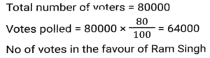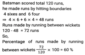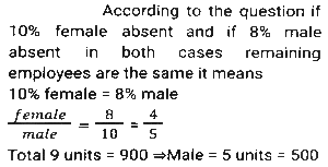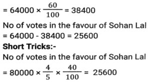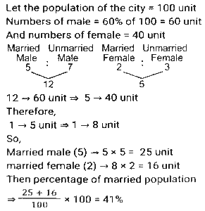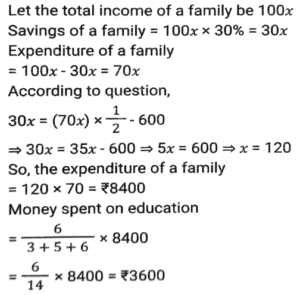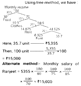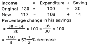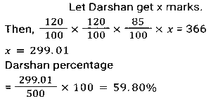 Percentage SSC-Maths (Part-7)Total Questions: 5031. A family saves 30% of the total income and the savings amount to ₹600 less than half of the expenditure. If the total expenditure is spent on health, food and education in the ratio of 3:5:6, then what amount of expenditure is spent on education? [Graduate Level 02/08/2022 (Shift-3)](a) ₹3,600(b) ₹1,800(c) ₹8,400(d) ₹7,200Correct Answer: (a) ₹3,600Solution:32. The income of an employee is 30% more than his expenditure. If his income decreases by 10% and his expenditure increases by 3%, then by what percent does his savings decrease or increase? [Graduate Level 04/08/2022 (Shift-2)](a) 48 ⅓ % decrease(b) 52 ¼ % decrease(c) 53 ⅓ % decrease(d) 50 ¼ % decreaseCorrect Answer: (c) 53 ⅓ % decreaseSolution:33. Ranjeet spends 30% of his monthly salary on food, 15% of the remaining salary on clothes, 25% of the remaining salary on rent, and 20% of the remaining salary on fuel and still saves an amount of ₹5,355. What is Ranjeet's monthly salary? [Graduate Level 04/08/2022 (Shift-4)](a) ₹12,000(b) ₹15,000(c) ₹20,000(d) ₹17,000Correct Answer: (b) ₹15,000Solution:34. In an election there were two candidates Ram Singh and Sohan Lal. The total no. of voters in the constituency was 80000 and 80% of the total votes were polled. If 60% of the polled votes were cast in favour of Ram Singh, how many votes were received by Sohan Lal ? [Higher Secondary 01/08/2022 (Shift-3)](a) 28000(b) 38400(c) 25600(d) 26700Correct Answer: (c) 25600Solution:35. In a competitive exam, the minimum qualifying percentages for Category A and Category B jobs are 25% and 45% respectively. A candidate scored 83 marks and failed to get a Category B job by 25 marks. What is the minimum qualifying marks to secure a Category A job? [SSC MTS 06/07/2022 (Morning)](a) 55(b) 60(c) 50(d) 65Correct Answer: (b) 60Solution:36. In a city 60% of the population are males and the rest are females. If the ratio of married males to non-married males is 5:7, and the ratio of married females to non-married females is 2:3, then what percentage of the total population is married? [SSC MTS 08/07/2022 (Afternoon)](a) 41%(b) 59%(c) 51%(d) 49%Correct Answer: (a) 41%Solution:37. A batsman scored 120 runs, which included 4 sixes and 6 fours. What percentage of his total score did he make by running between the wickets (runs that were scored only by running between the wickets and not by hitting fours and sixes)? [SSC MTS 11/07/2022 (Afternoon)](a) 30%(b) 50%(c) 60%(d) 40%Correct Answer: (c) 60%Solution:38. In an office of 900 employees, on a particular day, except for 10% of the female employees, all employees were present. On the next day, except for 8% of the male employees, all employees were present. The number of employees present on each of these two days was the same. Find the total number of male employees on the payrolls of this office. [SSC MTS 12/07/2022 (Morning)](a) 550(b) 450(c) 800(d) 500Correct Answer: (d) 500Solution:39. There are 45 students in a hostel. If the number of students increases by 5, the total expenses of the mess increase by ₹30 per day while the average daily expenditure per head diminishes by ₹2. Find the original total daily expenditure of the mess. [SSC MTS 13/07/2022 (Evening)](a) ₹1,170(b) ₹1,710(c) ₹1,200(d) ₹1,250Correct Answer: (a) ₹1,170Solution:Let the average expenses of 𝓍 Now according to the question 45𝓍 + 30 = 50 (𝓍 - 2) 45𝓍 + 30 = 50𝓍 -100 5𝓍 = 130 ⇒ 𝓍 = 26 Original expenditure = 45𝓍 = 45 × 26 = 1,170 Rs40. In university exams where the total maximum marks were 500, Mohit gets 20% more than Surendra, Surendra gets 20% more than Lalit, and Lalit gets 15% less than Darshan. If Mohit gets 366 marks, what percentage of the full marks does Darshan get? [Give your answer correct to 2 decimal places] [SSC MTS 14/07/2022 (Afternoon)](a) 82.50%(b) 59.80%(c) 58.02%(d) 80.50%Correct Answer: (b) 59.80%Solution:Submit Quiz« Previous12345Next »