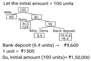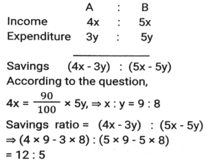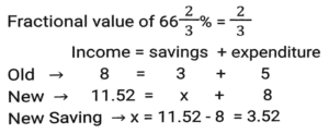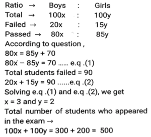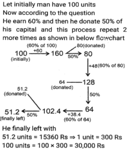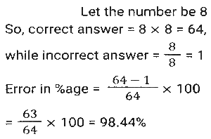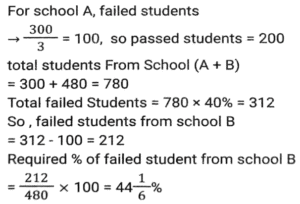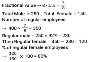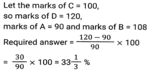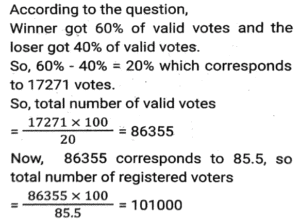 Percentage SSC-Maths (Part-8)Total Questions: 3711. Some students (only boys and girls) from different schools appeared for an Olympiad exam. 20% of the boys and 15% of the girls failed in the exam. The number of boys who passed the exam was 70 more than that of the girls who passed the exam'. A total of 90 students failed. Find the numbers of students that appeared for the exam. [SSC CGL 11/04/2022 (Morning)](a) 420(b) 400(c) 500(d) 350Correct Answer: (c) 500Solution:12. In a factory with 400 employees, the ratio of the number of male employees to that of female employees is 5:3. There are 87.5% regular employees in the factory. If 92% of male employees are regular employees. Then what is the percentage of regular female employees? [SSC CGL 13/04/2022 (Morning)](a) 80%(b) 78%(c) 87.5%(d) 85%Correct Answer: (a) 80%Solution:13. In an election between two candidates, 5% of the registered voters did not caste their vote. 10% of the votes were found to be either invalid or of NOTA. The winning candidate received 60% of the votes in his favour and won the election by 17271 votes. Find the number of registered voters. [SSC CGL 18/04/2022 (Evening)](a) 90525(b) 100000(c) 101000(d) 102500Correct Answer: (c) 101000Solution:14. A man started off a business with a certain capital amount. In the first year, he earned 60% Profit and donated 50% of the total capital (initial amount + profit). He followed the same procedure with the remaining capital after the second and the third year. If at the end of the three years, he is left with Rs. 15,360, what was the initial amount with which the man started his business? [SSC CGL 19/04/2022 (Morning)](a) 20,000(b) 30,000(c) 25,000(d) 32,000Correct Answer: (b) 30,000Solution:15. The income of A is 80% of B's income and the expenditure of A is 60% of B's expenditure. If the income of A is equal to 90% of B's expenditure, then by what percentage are the savings of A more than B's savings? [SSC CGL Tier II (29/01/2022)](a) 100%(b) 125%(c) 150%(d) 140%Correct Answer: (d) 140%Solution:16. The monthly expenses of a person are 66⅔ % more than her monthly savings. If her monthly income increases by 44% and her monthly expenses increases by 60%, then there is an increase of ₹1,040 in her monthly savings. What is the initial expenditure (in ₹)? [SSC CGL Tier II (29/01/2022)](a) 10,000(b) 12,000(c) 9,000(d) 13,000Correct Answer: (a) 10,000Solution:17. In an examination, B obtained 20% more marks than those obtained by A, and A obtained 10% less marks than those obtained by C. D obtained 20% more marks than those obtained by C. By what percentage are the marks obtained by D more than those obtained by A ? [SSC CGL Tier II (03/02/2022)](a) 33 ⅓ %(b) 13 ⅓ %(c) 43 ⅓ %(d) 23 ⅓ %Correct Answer: (a) 33 ⅓ %Solution:18. A number was divided by 8, instead of being multiplied by 8. As a result of this, there was an error in the answer. What is the percentage difference (correct to two places of decimal) in the answer due to this miscalculation? [SSC MTS 08/10/2021 (Morning)](a) 48.67%(b) 67.33%(c) 98.44%(d) 72.00%Correct Answer: (c) 98.44%Solution:19. Varun gave 60% of the money he had to his wife. He also gave 20% of the remaining amount to each of his three children. Three-fifth of the amount now left was spent on miscellaneous items, and the remaining amount of ₹9,600 was deposited in the bank. How much money did Varun have initially? [SSC MTS 13/10/2021 (Evening)](a) ₹2,00,000(b) ₹1,80,000(c) ₹1,50,000(d) ₹1,60,000Correct Answer: (c) ₹1,50,000Solution:20. Last year, 300 students appeared for an examination from school A, and 33⅓ % of the students failed. In the same year, 480 students appeared for the examination from school B. 60% of the total students from schools A and B passed. What is the fail percentage of students from school B? [SSC MTS 14/10/2021 (Evening)](a) 44 ⅙ %(b) 40 ⅔ %(c) 42 ⅓ %(d) 44 ⅙ %Correct Answer: (d) 44 ⅙ %Solution:Submit Quiz« Previous1234Next »