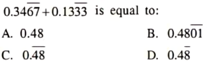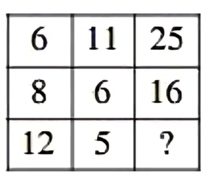 PGT Commerce Level-3 (HTEТ), Exam 2021Total Questions: 11071. The price of any item is increased by 20%. Find the reduction in the consumption of the item by a consumer so that there is no increase on his expenditure:A.B.C.D.Correct Answer: A.Solution:72. What is the value ofA.B.C.D.Correct Answer: D.Solution:73. Two trains 132 meters and 108 meters long are running in opposite direction, one at the speed of 32 km/hr and another at the speed of 40 km/hr. In what time will they cross each other?A. 8 sec.B. 10 sec.C. 12 sec.D. 11 sec.Correct Answer: C. 12 sec.Solution:74. Solve the following equation?A.B.C.D.Correct Answer: B.Solution:75. What is the HCF of 11, 11.11, 0.11, 0.011?A. 0.011В. 1.1C. 0.11D. 0.111Correct Answer: A. 0.011Solution:76. The ratio of the areas of the incircle and circumcircle of a square will be:A. 1 : 4B. 4 : 1C. 1 : 2D. 2 : 1Correct Answer: C. 1 : 2Solution: 77. Find the missing letters in the given letter series:a_cdaab_cc_daa_bbb_ccdddA. bdbdaB. bddcаC. dbbсаD. bbdaсCorrect Answer: D. bbdaс78. The number in the following question numbers are written according to certain pattern row-wise or columnwise. Identify the pattern and find the missing character accordingly.A. 18B. 16C. 12D. 10Correct Answer: B. 16Solution:79. Find the next term of the number series:127, 128, 136, 163, 227,_____.A. 352B. 350C. 357D. 341Correct Answer: A. 352Solution:80. There are five different houses A to E in a row. A is to the right of B and E is to the left of C and right of A. B is to the right of D. Which of the house is exactly in the middle?A. AB. BC. DD. ECorrect Answer: A. ASolution:Submit Quiz« Previous1234567891011Next »