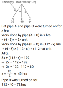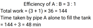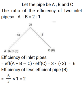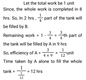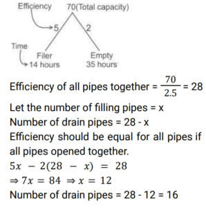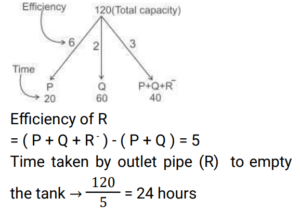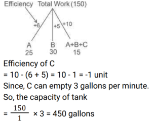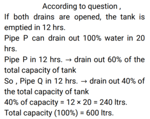 Pipe and Cistern (Railway Maths) (Part – I)Total Questions: 5011. 28 pipes are connected to a tank. Some of them pour water into the tank, whereas the rest drain water out of it. Each of the pipes that fill water can fill the empty tank in 14 hours, whereas any of the drainpipes can empty the filled tank in 35 hours, If all the pipes are opened simultaneously when the tank is empty and the tank is filled in 2.5 hours, how many of pipes were drain pipes ? [NTPC CBT - I 19/03/2021 (Morning) ](a) 16(b) 18(c) 17(d) 15Correct Answer: (a) 16Solution:12. Two pipes can fill a tank in 20 hours and 60 hours respectively. A third pipe is an outlet pipe. If all three are opened together, the tank gets filled up in 40 hours. What time will the outlet pipe take to empty the full tank? [RRB JE 29/05/2019 (Afternoon)](a) 24 hours(b) 28 hours(c) 20 hours(d) 30 hoursCorrect Answer: (a) 24 hoursSolution:13. A pipe P can drain out water from a tank in 20 hours. Another pipe Q can drain 20 litres per hour. If both drains are opened, the tank is emptied in 12 hours. What is the capacity of the tank? [RRB JE 02/06/2019 (Afternoon)](a) 400 litres(b) 800 litres(c) 650 litres(d) 600 litresCorrect Answer: (d) 600 litresSolution:14. A tank is fitted with three inlets. The first two when opened simultaneously fill the tank in the same time as that taken by the third inlet alone. The second inlet can fill the tank 5 hours faster than the first and 4 hours slower than the third. In how many hours can the first inlet alone fill the tank? [RRB JE 26/06/2019 (Morning)](a) 15 hours(b) 6 hours(c) 12 hours(d) 10 hoursCorrect Answer: (a) 15 hoursSolution:15. Pipes A and B, when working together, can fill an empty tank in 8 hours. If B is stopped after 2 hours, it will take a total of 11 hours to fill the tank. How long would it take A to fill the empty tank alone? [RRB ALP Tier-I 14/08/2018 (Evening)](a) 13 hours(b) 12 hours(c) 16 hours(d) 15 hoursCorrect Answer: (b) 12 hoursSolution:16. One of the two inlet pipes works twice as efficiently as the other. The two, working alongside a drain pipe that can empty a cistern all by itself in 8 hours, can fill the empty cistern in 8 hours. How many hours will the less efficient inlet pipe take to fill the empty cistern by itself ? [RRB ALP Tier - I 17/08/2018 (Afternoon) ](a) 8(b) 6(c) 12(d) 10Correct Answer: (c) 12Solution:17. Two pipes A and B can fill an empty cistern in 32 and 48 hours, respectively. Pipe C can drain the entire cistern in 64 hours when no other pipe is in operation. Initially, when the cistern was empty Pipe A and Pipe C were turned on. After a few hours, Pipe A was turned off and Pipe B was turned on instantly. In all it took 112 hours to fill the cistern. For how many hours was Pipe B turned on ? [RRB ALP Tier - I 29/08/2018 (Afternoon) ](a) 84(b) 77(c) 70(d) 72Correct Answer: (d) 72Solution:18. Two pipes namely A,B can fill a sump in 25 minutes and half an hour respectively and a pipe C can empty 3 gallons per minute. All the three pipes working together can fill the tank in 15 minutes. The capacity of the tank is: [RRB ALP Tier - I 30/08/2018 (Morning) ](a) 600 gallons(b) 240 gallons(c) 450 gallons(d) 300 gallonsCorrect Answer: (c) 450 gallonsSolution:19. Pipe A is 3 times faster than pipe B. Both pipes together fill a tank in 36 min. How much time will pipe A alone take to fill the tank ? [Group D 25/08/2022 (Morning) ](a) 80 min(b) 100 min(c) 156 min(d) 48 minCorrect Answer: (d) 48 minSolution:20. Two pipes A and B can fill the tank in 5 hours and 8 hours respectively. Pipe C can empty the same tank in 10 hours. Find the time taken to fill the empty tank when all the pipes are opened simultaneously. [Group D 25/08/2022 (Evening) ](a)(b)(c)(d)Correct Answer: (b)Solution:Submit Quiz« Previous12345Next »