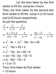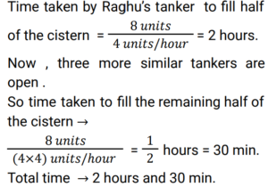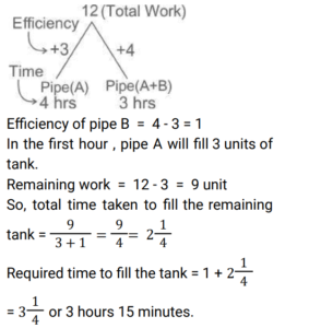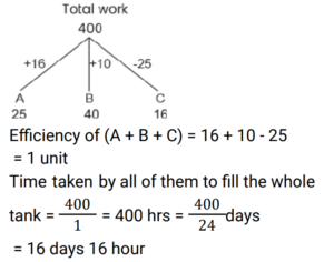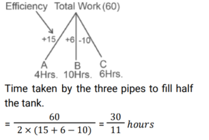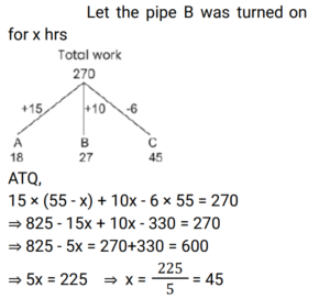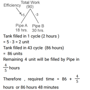 Pipe and Cistern (Railway Maths) (Part – II)Total Questions: 3931. Two pipes A and B can fill an empty cistern in 18 and 27 hours, respectively. Pipe C can drain the entire cistern in 45 hours when no other pipe is in operation. Initially, when the cistern was empty Pipe A and Pipe C were turned on. After a few hours Pipe A was turned off and Pipe B was turned on instantly. In all, it took 55 hours to fill the cistern. For how many hours was pipe B turned on ? [RRB ALP 17/08/2018 (Morning) ](a) 30(b) 27(c) 45(d) 50Correct Answer: (c) 45Solution:32. Two pipes fill a tank when working individually in 25 and 40 hours, respectively while a third pipe can drain the filled tank in 16 hours. If all the three pipes are turned on at the same time when the tank is empty, how long will it take to fill the tank completely? [RRB ALP 17/08/2018 (Afternoon)](a) 15 days 18 hours(b) 2 days 1 hours(c) 16 days 16 hours(d) 1 day 7 hoursCorrect Answer: (c) 16 days 16 hoursSolution:33. Raghu's tanker can fill a cistern in 4 hours. After half the cistern is filled, three more similar tankers are opened. What is the total time taken to fill the cistern completely? [RRB ALP 20/08/2018 (Afternoon)](a) 2 h 40 min(b) 2 h 30 min(c) 2 h(d) 3 hCorrect Answer: (b) 2 h 30 minSolution:34. P, Q and R are channels which discharge solutions A, B, C respectively in a tank. When the tank is empty and all the three channels are opened, what is the proportion of the solution C in the tank after 3 minutes, if the channels P, Q and R can fill the tank from empty to full in 30 minutes and 20 minutes and 10 minutes respectively when they are opened one at a time. [RRB ALP 21/08/2018 (Morning) ](a) 5(b) 6(c) 6/11(d) 5/11Correct Answer: (c) 6/11Solution:35. A tank is filled by three tankers with uniform flow. The first two tankers operating simultaneously fill the sump in the same time during which the sump is filled by the third tanker alone. The second tanker fills the sump 5 hours faster than the first tanker and 4 hours slower than the third tanker. The time required by the first tanker is: [RRB ALP 21/08/2018 (Evening)](a) 16 hours(b) 9 hours(c) 10 hours(d) 15 hoursCorrect Answer: (d) 15 hoursSolution:36. A pump can fill a tank in 4 hours, but due to a leak, the tank now gets filled in 5 hours. How long will it take the leakage to empty the tank when it is full? [RRB ALP 29/08/2018 (Evening)](a) 20 hours(b) 4.5 hours(c) 9 hours(d) 1 hourCorrect Answer: (a) 20 hoursSolution:37. Pipe A could fill an empty cistern in 18 hours while Pipe B can drain a filled cistern in 30 hours. When the cistern is empty, Pipe A is turned on for an hour and then turned off. Now Pipe B is allowed to drain out water from the cistern for an hour and then turned off. The pipes were alternately left open for an hour each time till the cistern was full. How much time did it take for the cistern to be full? [RRB ALP 30/08/2018 (Evening) ](a) 45 hours(b) 86 hours 40 minutes(c) 90 hours(d) 86 hours 48 minutesCorrect Answer: (d) 86 hours 48 minutesSolution:38. Pipe A can fill an empty cistern in 4 hours while along with Pipe B it can fill it up in 3 hours. Only Pipe A is turned on for an hour after which Pipe B is also turned on. How much total time will it take to fill up the cistern? [RRB ALP 31/08/2018 (Afternoon) ](a) 3 hours(b) 3 hours 15 minutes(c) 3 hours 20 minutes(d) 3 hours 25 minutesCorrect Answer: (b) 3 hours 15 minutesSolution:39. Pipes A, B and C are attached to an empty cistern. While the first two can fill the cistern in 4 and 10 hours, respectively, the third can drain the cistern, when filled, in 6 hours. If all the three pipes are opened simultaneously when the cistern is half-full, how many hours will be needed to fill the cistern ? [RRB ALP 31/08/2018 (Evening) ](a) 90/11(b) 30/11(c) 60/11(d) 120/11Correct Answer: (b) 30/11Solution:Submit Quiz« Previous1234