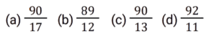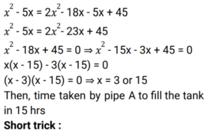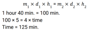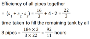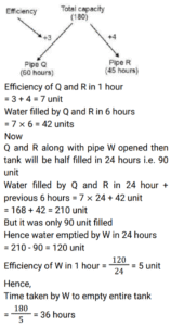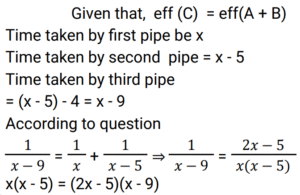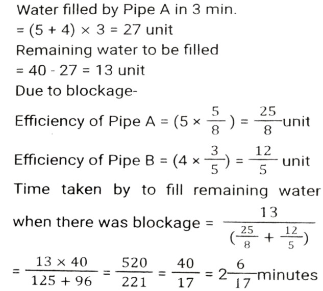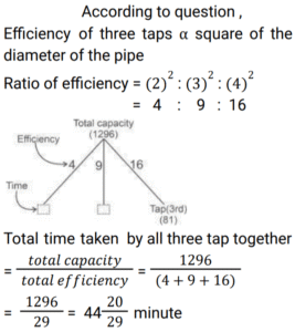 Pipe and Cistern (SSC)Total Questions: 501. A cistern can be filled by two pipes in 8 minutes and 10 minutes, separately. Both the pipes are opened together for a certain time, but due to an obstruction, only 5/8 of the full quantity of water flowed through the former pipe and 3/5 through the latter pipe. However, the obstruction was suddenly removed, and the cistern was filled in 3 minutes from that moment. How long did it take before the full flow began? [SSC CGL 26/09/2024 (2ⁿᵈ and 3ʳᵈ Shift)](a)(b)(c)(d)Correct Answer: (b)Solution:2. Three pipes, P, Q and R, together take four hours to fill a tank. All the three pipes were opened at the same time. After three hours, P was closed, and Q and R filled the remaining tank in two hours. How many hours will P alone take to fill the tank? [SSC CGL 23/09/2024 (2nd Shift)](a) 8(b) 10(c) 12(d) 9Correct Answer: (a) 8Solution: 3. Pipe Q can fill the tank in 60 hours while pipe R may fill in 45 hours. Q and R pipes are opened together for 6 hours after which pipe W is also opened to empty the tank. All three pipes are opened simultaneously for 24 hours to reach the half level mark. How much time (in hours) will pipe W alone take to empty the entire tank? [SSC CGL 18/09/2024 (3rd Shift)](a) 48(b) 42(c) 36(d) 30Correct Answer: (c) 36Solution:4. The tank is filled by three pipes with different uniform flow rates. While the first two pipes are operating simultaneously, they fill the tank in the same duration that the third pipe takes to fill it alone. The second pipe can fill the tank 5 hours quicker than the first pipe, yet 4 hours slower than the third pipe. What is the time (in hours) needed for the first pipe to fill the tank? [SSC CGL 11/09/2024 (3rd Shift)](a) 18(b) 12(c) 9(d) 15Correct Answer: (d) 15Solution: 5. Two pipes can fill a cistern in 12 hours and 16 hours, respectively. The pipes are opened simultaneously and it is found that due to leakage at the bottom, it takes 90 minutes more to fill the cistern. How much time will the leakage take to empty the completely filled tank ? [SSC CPO 04/10/2023 (3rd Shift)](a)(b)(c)(d)Correct Answer: (d)Solution:6. An inlet pipe can fill an empty tank in 3.6 hours, while an outlet pipe can drain a completely-filled tank in 6.3 hours. If both the pipes are opened simultaneously when the tank is empty, in how many hours will the tank get completely filled ? [SSC CPO 04/10/2023 (1st Shift)](a) 8.7(b) 8.1(c) 9.0(d) 8.4Correct Answer: (d) 8.4Solution:7. 5 pipes are required to fill a tank in 1 hour and 40 minutes. How long (in minutes) will it take to fill the same tank if 4 pipes of the same type are used? [SSC MTS 11/09/2023 (2nd Shift)](a) 115(b) 150(c) 125(d) 140Correct Answer: (c) 125Solution:8. Two pipes S1 and S2 alone can fill an empty tank in 15 hours and 20 hours respectively. Pipe S3 alone can empty that completely filled tank in 40 hours. Firstly both pipes S1 and S2 are opened and after 2 hour pipe S3 is also opened. In how much time(in hrs) tank will be completely filled after S3 is opened? [SSC CGL 21/07/2023 (2nd shift)](a)(b)(c)(d)Correct Answer: (d)Solution: 9. An inlet pipe can fill an empty tank in 140 hours while an outlet pipe drains a completely-filled tank in 63 hours. If 8 inlet pipes and y outlet pipes are opened simultaneously, when the tank is empty, then the tank gets completely filled in 105 hours. Find the value of y. [SSC CGL 14/07/2023 (3rd shift)](a) 1(b) 4(c) 2(d) 3Correct Answer: (d) 3Solution:10. There are three taps of diameter 2 cm, 3 cm and 4 cm, respectively. The ratio of the water flowing through them is equal to the ratio of the square of their diameters. The biggest tap can fill an empty tank alone in 81 min. If all the taps are opened simultaneously, then how long will the tank take (in min) to be filled? [SSC CGL Tier II (02/03/2023)](a)(b)(c)(d)Correct Answer: (d)Solution:Submit Quiz12345Next »