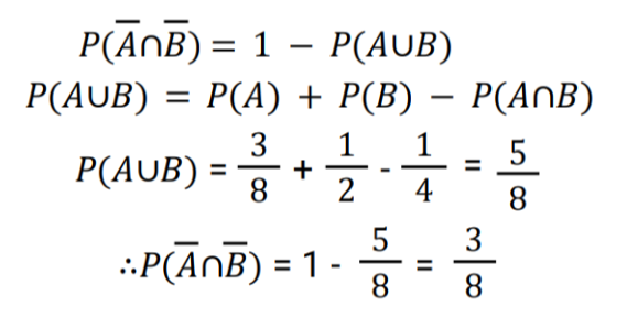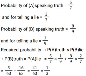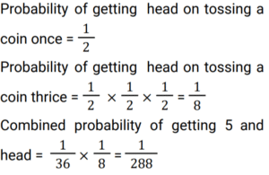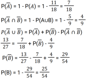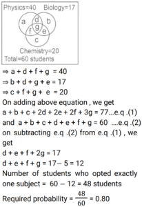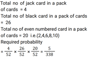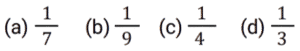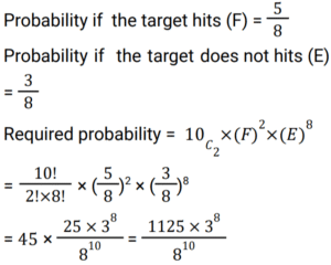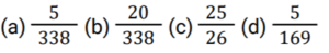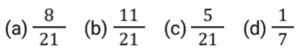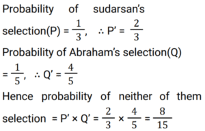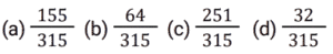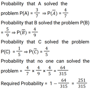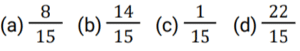 Probability (SSC)Total Questions: 641. A die is cast twice and a coin is tossed thrice. Find the probability that the die will turn a 5 each time and the coin will turn a head every time. [SSC CHSL Tier II (18/11/2024)](a)(b)(c)(d)Correct Answer: (c)Solution: 2. If A and B are events with P(A) = 3/8, P(B) = 1/2 and P(A ∩ B) = 1/4, find P(Ā ∩ B̄). [SSC CHSL Tier II (02/11/2023)](a)(b)(c)(d)Correct Answer: (b)Solution:3. Sudarsan and Abraham appear for an interview for two vacancies. The probability of Sudarsan’s selection is 1/3 and that of Abraham’s selection is 1/5. Find the probability that none of them be selected. [SSC CHSL Tier II (10/01/2024)](a)(b)(c)(d)Correct Answer: (a)Solution:4. If (A ∩ B) = 5/9, P(Ā ∩ B̄) = 13/27, P(A) = 11/18, then the odds against the event B are: [SSC CGL Tier II ( 26/10/2023 )](a)(b)(c)(d)Correct Answer: (c)Solution: 5. Three cards are drawn one after another with replacement from a pack of cards. What is the probability of getting first card a Jack, second card a black card, and third card an even numbered card? [SSC CGL Tier II ( 26/10/2023 )](a)(b)(c)(d)Correct Answer: (a)Solution:6. In grade 11 of a school, 40 students opted for Physics, 17 opted for Biology, and 20 opted for Chemistry. If the total number of students in grade 11 was 60, all of these students opted for at least one of the three subjects mentioned here, and exactly five of these students opted for all these three subjects, what is the probability that a randomly selected student of grade 11 of this school would have opted for exactly one of these three subjects? [SSC CHSL Tier II (26/06/2023)](a) 0.75(b) 0.85(c) 0.90(d) 0.80Correct Answer: (d) 0.80Solution:7. A person can hit a target 5 times out of 8 shots. If he fires 10 shots, what is the probability that he will hit the target twice? [SSC CGL Tier II (07/03/2023)](a)(b)(c)(d)Correct Answer: (d)Solution:8. The probabilities of solving a problem by three students A, B and C are 3/7, 5/9 and 1/5, respectively. The probability that problem will be solved is: [SSC CGL Tier II (06/03/2023)](a)(b)(c)(d)Correct Answer: (c)Solution:9. A speaks the truth 5 out of 7 times and B speaks truth 8 out of 9 times. What is the probability that they contradict each other in stating the same fact? [SSC CGL Tier II (03/03/2023)](a)(b)(c)(d)Correct Answer: (d)Solution:10. A glass jar contains 6 white, 8 black, 4 red and 3 blue marbles. If a single marble is chosen at random from the jar, what is the probability that it is black or blue? [SSC CGL Tier II (02/03/2023)](a)(b)(b)(d)Correct Answer: (b)Solution:Submit Quiz1234567Next »