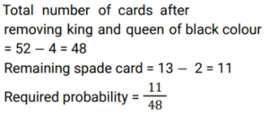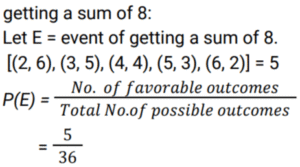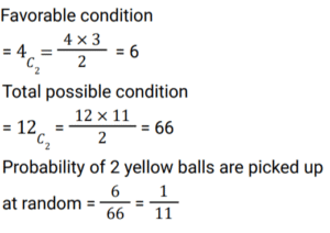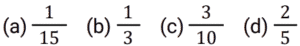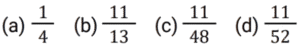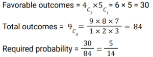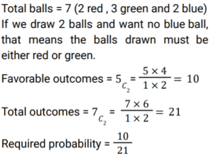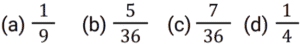 Probability (SSC)Total Questions: 6451. A bag contains 2 red , 3 green and 2 blue balls. Two balls are drawn at random. What is the probability that none of the balls drawn is blue?(a)(b)(c)(d)Correct Answer: (a)Solution:52. There are 10 points lie on a circle. By joining points how many triangles can be drawn from these points ?(a) 61(b) 119(c) 120(d) 60Correct Answer: (c) 120Solution:53. If we select 3 persons randomly from a group, consisting of 4 men, 3 women and 2 boys, then the probability that 2 men are selected is:(a)(b)(c)(d)Correct Answer: (a)Solution:54. An urn contains 10 black and 5 white balls. Two balls are drawn from the urn one after the other without replacement. What is the probability that both drawn balls are black?(a)(b)(c)(d)Correct Answer: (b)Solution:55. Two dice are thrown simultaneously. Find the probability of getting a sum of 8 ?(a)(b)(c)(d)Correct Answer: (b)Solution:56. A box contains 2 black, 6 green and 4 yellow balls. If 2 balls are picked up at random, the probability that both are yellow is:(a)(b)(c)(d)Correct Answer: (d)Solution:57. Kings and Queens of black color are taken out from a deck of 52 playing cards. A card is drawn from the remaining well-shuffled cards. Probability of getting a spade card is:(a)(b)(c)(d)Correct Answer: (c)Solution:58. A bag contains balls numbered 1, 2, 3, ………. 30. One ball is drawn from the bag at random. What is the probability that the number on the ball drawn is divisible by 4 or 6?(a)(b)(c)(d)Correct Answer: (b)Solution:59. A bag contains balls numbered 1, 2, 3, ……...29. One ball is drawn from the bag at random. What is the probability that the number on the ball drawn is divisible by 3 or 5 ?(a)(b)(c)(d)Correct Answer: (c)Solution:60. Daniel speaks truth in 2/5 cases and Sherin lies in 3/7 cases. What is the percentage of cases in which both Daniel and Sherin contradict each other in stating a fact?(a) 72.6%(b) 51.4%(c) 62.3%(d).47.5%Correct Answer: (b) 51.4%Solution:Submit Quiz« Previous1234567Next »