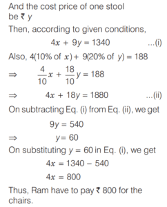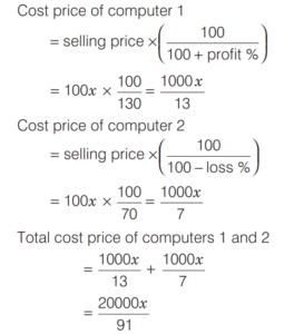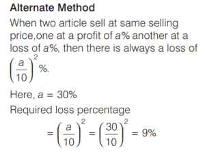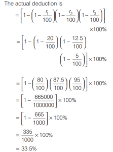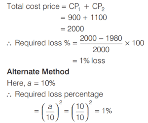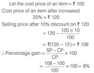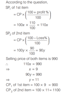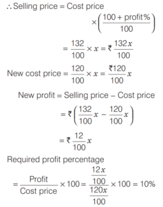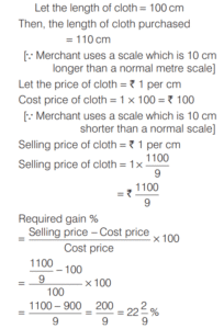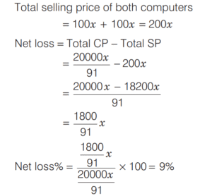 PROFIT AND LOSS (CDS)Total Questions: 161. A trader sells two computers at the same price, making a profit of 30% on one and a loss of 30% on the other. What is the net loss or profit percentage on the transaction? [2019 (II) Evening Shift ](a) 6% loss(b) 6% gain(c) 9% loss(d) 9% gainCorrect Answer: (c) 9% lossSolution:Let the selling price of each computers be 100x. 2. A person sells two items each at Rs. 990, one at a profit of 10% and another at a loss of 10%. What is the combined percentage of profit or loss for the two items? [2019 (II) Evening Shift ](a) 1% loss(b) 1% profit(c) No profit no loss(d) 0.5% profitCorrect Answer: (a) 1% lossSolution:Let CP of 1st and 2nd items are 100x and 100y respectively. 3. If an article is sold at a gain of 6% instead of a loss of 6%, the seller gets ` 6 more. What is the cost price of the article? [2019 (I) Morning Shift ](a) ₹18(b) ₹36(c) ₹42(d) ₹50Correct Answer: (d) ₹50Solution:Let cost price of an article = ₹x4. A milk vendor bought 28 L of milk at the rate of ₹8.50 /L. After adding some water he sold the mixture at the same price. If his gain is 12.5%, how much water did he add? [2018 (II) Evening Shift ](a) 4.5 L(b) 4 L(c) 3.5 L(d) 3 LCorrect Answer: (c) 3.5 LSolution:Cost price of 28L of milk = 8.50 × 28 = ₹2385. An article is sold at a profit of 32%. If the cost price is increased by 20% and the sale price remains the same, then the profit percentage becomes [2018 (I) Morning Shift ](a) 10%(b) 12%(c) 15%(d) 20%Correct Answer: (a) 10%Solution:Let the cost price of article be ₹x. Profit percentage = 32%6. Sudhir purchased a chair with three consecutive discounts of 20%, 12.5% and 5%. The actual deduction will be [2017 (II) Evening Shift](a) 33.5%(b) 30%(c) 32%(d) 35%Correct Answer: (a) 33.5%Solution:We have given three consecutive discount 20%, 12.5% and 5%.7. Ram buys 4 chairs and 9 stools for ₹1340. If he sells chairs at 10% profit and stools at 20% profit, he earns a total profit of ₹188. How much money did he have to pay for the chairs? [2017 (II) Evening Shift](a) ₹200(b) ₹400(c) ₹800(d) ₹1600Correct Answer: (c) ₹800Solution:Let the cost price of one chair be ₹x.8. Rajendra bought a mobile with 25% discount on the selling price. If the mobile cost him ₹4875, what is the original selling price of the mobile? [2017 (I) Morning Shift ](a) ₹6300(b) ₹6400(c) ₹6500(d) ₹6600Correct Answer: (c) ₹6500Solution:9. A shopkeeper increases the cost price of an item by 20% and offers a discount of 10% on this marked price. What is his gain percentage? [2016 (II) Evening Shift](a) 15%(b) 12%(c) 10%(d) 8%Correct Answer: (d) 8%Solution:10. A cloth merchant buys cloth from a weaver and cheats him by using a scale which is 10 cm longer than a normal metre scale. He claims to sell cloth at the cost price to his customers, but while selling uses a scale which is 10 cm shorter than a normal metre scale. What is his gain? [2016 (I) Morning Shift ](a) 20 %(b) 21 %(c) 22²⁄₉ %(d) 23⅓ %Correct Answer: (c) 22²⁄₉ %Solution:Submit Quiz12Next »