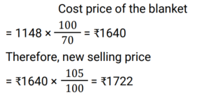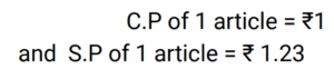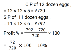 Profit and Loss (Railway Maths) (Part – I)Total Questions: 5031. If the cost price of an article is ₹2,500 and its selling price is ₹2,375, then the loss percentage is: [Group D 17/08/2022 (Morning) ](a) 3%(b) 5%(c) 4%(d) 6%Correct Answer: (b) 5%Solution:32. Venkat bought a second-hand scooter and spent 10% of the cost on its repairs. He sold the scooter for a profit of 2,200. How much did he spend on repairs if he made a profit of 20%? [Group D 17/08/2022 (Evening)](a) Rs. 1,200(b) Rs. 750(c) Rs. 1,000(d) Rs. 400Correct Answer: (c) Rs. 1,000Solution:33. A shopkeeper sold a book at a loss of 14%. If the selling price had been increased by ₹100, there would have been a gain of 6%. What was the cost price (in Rs.) of the book? [Group D 17/08/2022 (Evening)](a) ₹650(b) ₹500(c) ₹970(d) ₹450Correct Answer: (b) ₹500Solution:34. A television costs Rs. 35,000 less than a printer. If the cost of the printer is twice the cost of the television, then the cost of the television is: [Group D 18/08/2022 (Morning)](a) Rs. 53,000(b) Rs. 15,700(c) Rs. 17,500(d) Rs. 35,000Correct Answer: (d) Rs. 35,000Solution:35. A man buys 15 identical articles for a total of ₹15. If he sells each of them for ₹1.23, then his profit percentage is: [Group D 18/08/2022 (Afternoon)](a) 23%(b) 32%(c) 50%(d) 8%Correct Answer: (a) 23%Solution:36. A shopkeeper sells an item at a profit of 25% and dishonestly uses a weight that is 30% less than the actual weight. Find his total profit. [Group D 18/08/2022 (Evening)](a) 65.75%(b) 78.57%(c) 23%(d) 42%Correct Answer: (b) 78.57%Solution:37. A blanket is sold for Rs. 1,148, which results in a loss of 30%. For how much should it be sold to gain 5%? [Group D 22/08/2022 (Morning)](a) ₹1,734(b) ₹1,543(c) ₹1,423(d) ₹1,722Correct Answer: (d) ₹1,722Solution:38. The price of an article is increased by 20% and then two successive discounts of 5% each are allowed. The selling price of the article is ______ above its cost price. [Group D 22/08/2022 (Morning)](a) 6.9%(b) 7.8%(c) 9.2%(d) 8.3%Correct Answer: (d) 8.3%Solution:39. By selling an item at a 10% profit a seller makes a profit of ₹777.70. Find the cost price of the item. [Group D 22/08/2022 (Afternoon)](a) ₹7,707(b) ₹7,777(c) ₹7,277(d) ₹7,177Correct Answer: (b) ₹7,777Solution:40. A shopkeeper bought 12 dozen eggs at the rate of ₹5 per egg. 12 eggs broke in transit. He sold the remaining eggs at the rate of ₹6 per egg. Find his percentage of profit. [Group D 22/08/2022 (Evening) ](a) 15%(b) 10%(c) 3.5%(d) 20%Correct Answer: (b) 10%Solution:Submit Quiz« Previous12345Next »