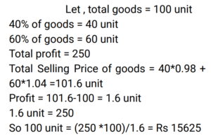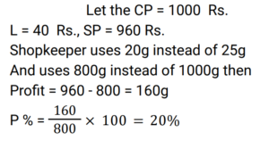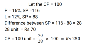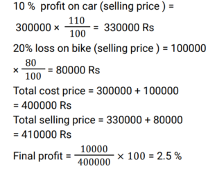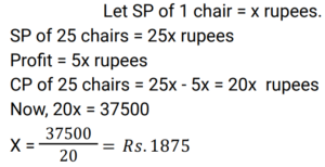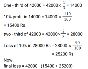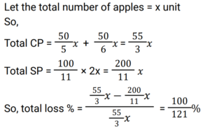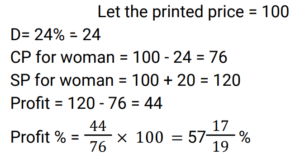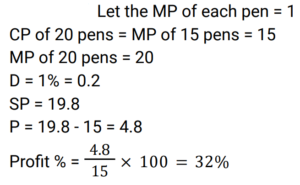 Profit and Loss (Railway Maths) (Part – VI)Total Questions: 501. A woman buys a car at 24% discount of the printed price and sells it at a 20% higher of printed price. Her percentage gain is: [RRB NTPC 02/03/2021 (Evening) ](a)(b)(c)(d)Correct Answer: (b)Solution:2. The profit earned after selling an article for Rs. 1,875 is the same as the loss occurred after selling the article for Rs. 1,385. What is the cost price (in Rs) of the article? [RRB NTPC 02/03/2021 (Evening)](a) Rs. 1,660(b) Rs. 1,650(c) Rs. 1,360(d) Rs. 1,630Correct Answer: (d) Rs. 1,630Solution:CP of the article = 1875 + 1385/2 = 16303. A man sells flowers at 4% loss on cost price but he uses 20 g instead of 25 g weight to measure. What is his percentage profit? [RRB NTPC 03/03/2021 (Morning)](a) 40%(b) 60%(c) 20%(d) 10%Correct Answer: (c) 20%Solution:4. A shopkeeper bought 25 chairs from a manufacturer for Rs. 37,500 and sold them at a profit equal to the selling price of 5 chairs. Then the SP of one chair is. [RRB NTPC 03/03/2021 (Evening)](a) Rs. 1500(b) Rs. 1200(c) Rs. 1250(d) Rs. 1875Correct Answer: (d) Rs. 1875Solution:5. A man bought a number of apples at 5 for Rs. 50 and an equal number at 6 for Rs. 50. If he sells them at 11 for Rs. 100, what would be his percentage profit or loss? [RRB NTPC 03/03/2021 (Evening) ](a) 100/121 % loss(b) 100/121 % profit(c) 121/100 % loss(d) 121/100 % profitCorrect Answer: (a) 100/121 % lossSolution:6. A retailer buys 20 pens at the marked price of 15 pens from a wholesaler. If he sells these 20 pens giving a discount of 1%, then what is the profit percent of the retailer? [RRB NTPC 04/03/2021 (Morning)](a) 35%(b) 25%(c) 32%(d) 30%Correct Answer: (c) 32%Solution:7. Ram invested Rs. 42,000/- in the shares of a company. He sold one-third of the total shares at a profit of 10%. He sold the remaining shares at 10% loss. How much did Ram lose? [RRB NTPC 04/03/2021 (Evening)](a) Rs. 5,200(b) Rs. 4,200(c) Rs. 1,400(d) Rs. 4,000Correct Answer: (c) Rs. 1,400Solution:8. 40% of the goods are sold at 2% loss while the rest of the goods are sold at 4% profit. If there is a total profit of Rs. 250, then the cost price of goods sold is: [RRB NTPC 05/03/2021 (Morning)](a) 15625(b) 5625(c) 9000(d) 6525Correct Answer: (a) 15625Solution:9. Babu purchased a car for Rs. 300000 and a bike for his son for Rs. 100000. He sold the car at a profit of 10% and bike at loss of 20%. What is the net gain or loss? [RRB NTPC 05/03/2021 (Morning)](a) 2.5% gain(b) 2.5% loss(c) 2% gain(d) 1.5% lossCorrect Answer: (a) 2.5% gainSolution:10. The difference between a 16% profit and a 12% loss while selling an article is Rs. 70. What is the cost price of the article? [RRB NTPC 05/03/2021 (Evening)](a) Rs. 240(b) Rs. 225(c) Rs. 250(d) Rs. 235Correct Answer: (c) Rs. 250Solution:Submit Quiz12345Next »