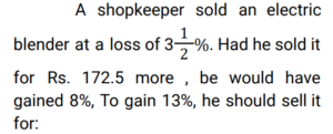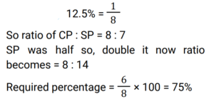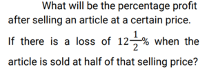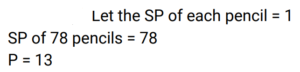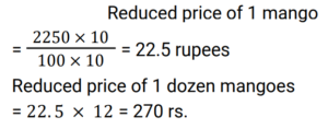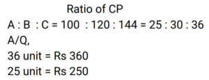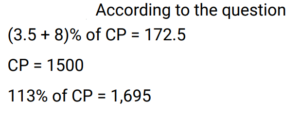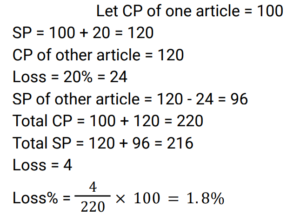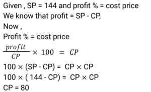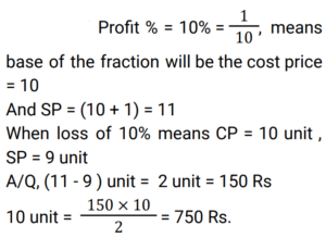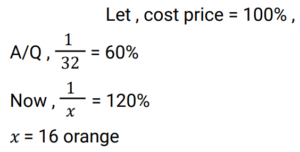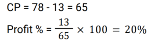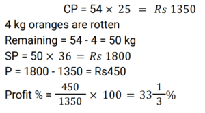 Profit and Loss (Railway Maths) (Part – VI)Total Questions: 5021. A retailer buys a bag containing 54 kg oranges at Rs. 25 per kg. Later upon sorting he finds that 4 kg oranges are rotten, he throws them and sells the remaining ones at Rs. 36 per kg. Find his profit percent. [RRB NTPC 15/03/2021 (Evening) ](a)(b)(c)(d)Correct Answer: (c)Solution:22. An article when sold at a profit of 10% gains Rs. 150 more than when it is sold at a loss of 10%. Its cost price is: [RRB NTPC 19/03/2021 (Morning)](a) Rs. 750(b) Rs. 735(c) Rs. 570(d) Rs. 577Correct Answer: (a) Rs. 750Solution:23. A woman sells 78 pencils and gets a profit equal to the selling price of 13 pencils. Her profit percentage is: [RRB NTPC 19/03/2021 (Evening)](a) 17(b) 9(c) 20(d) 19Correct Answer: (c) 20Solution:24. Find the answer of given question? [RRB NTPC 21/03/2021 (Morning) ](a) 80%(b) 70%(c) 60%(d) 75%Correct Answer: (d) 75%Solution:25. A reduction of 10% in the price of mangoes enables a person to buy 10 mangoes more for Rs. 2250. What is the price per dozen after reduction? [RRB NTPC 27/03/2021 (Morning) ](a) Rs. 165(b) Rs. 250(c) Rs. 225(d) Rs. 270Correct Answer: (d) Rs. 270Solution:26. Find the answer of given question? [RRB NTPC 27/03/2021 (Evening) ](a) Rs. 1,550(b) Rs. 1,595(c) Rs. 1,680(d) Rs. 1,695Correct Answer: (d) Rs. 1,695Solution:27. A sells an article to B at a profit of 20% and B sells it to C at a profit of 20%. If C pays Rs. 360 for it, what was the cost price for A? [RRB NTPC 01/04/2021 (Morning)](a) Rs. 308(b) Rs. 144(c) Rs. 250(d) Rs. 120Correct Answer: (c) Rs. 250Solution:28. Two articles are sold by a trader. One of them is sold for 20% profit. Its selling price equals the cost price of the other article which is sold for 20% loss. Find the effective profit/loss percentage approximately. [RRB NTPC 03/04/2021 (Morning)](a) 1.8% loss(b) 2.5% profit(c) 4% loss(d) 1.8% profitCorrect Answer: (a) 1.8% lossSolution:29. A person sold his watch for Rs.144 and got a percentage of profit equal to the cost price. Find the cost of the watch. [RRB NTPC 03/04/2021 (Evening) ](a) Rs.180(b) Rs.200(c) Rs.100(d) Rs.80Correct Answer: (d) Rs.80Solution:30. By selling 32 oranges for Rs. 1, a man incurs the loss of 40%. How many oranges must be sell for Rs.1 to gain 20%? [RRB NTPC 03/04/2021 (Evening) ](a) 16(b) 15(c) 20(d) 18Correct Answer: (a) 16Solution:Submit Quiz« Previous12345Next »