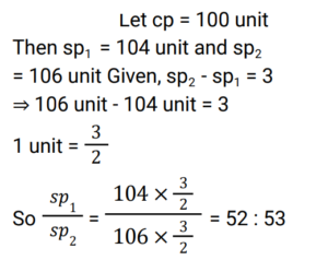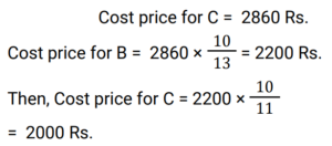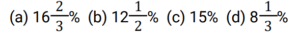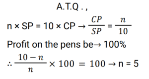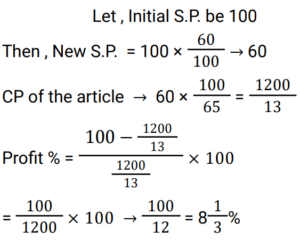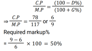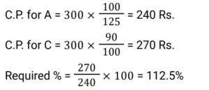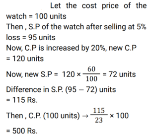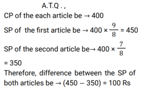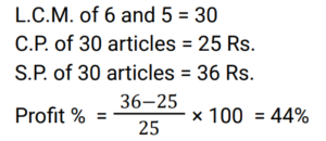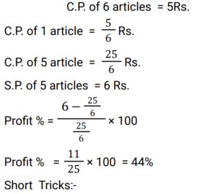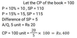 Profit and Loss (Railway Maths) (Part – VI)Total Questions: 5041. Anupama sold a book at a profit of 10%. Had she sold it for Rs. 20 more, 15% would have been gained. Find the cost price of the book. [RRB NTPC 26/07/2021 (Evening) ](a) Rs. 500(b) Rs. 375(c) Rs. 450(d) Rs. 400Correct Answer: (d) Rs. 400Solution:42. A watch is sold at 5% loss. If the cost price had been 20% more and selling price Rs. 115 less, there would have been 40% loss. What is the cost price? [RRB JE 22/05/2019 (Afternoon)](a) Rs. 500(b) Rs. 520(c) Rs. 450(d) Rs. 550Correct Answer: (a) Rs. 500Solution:43. What is the gain percent when articles bought at 6 pieces for Rs. 5 are sold at 5 pieces for Rs. 6? [RRB JE 23/05/2019 (Morning)](a) 30%(b) 44%(c) 33%(d) 25%Correct Answer: (b) 44%Solution:44. A sells goods to B at 25% profit for Rs. 300. B sells it to C at 10% loss. In this sale, C's cost price is equal to what percent of A's cost price? [RRB JE 23/05/2019 (Morning)](a) 87.5%(b) 110%(c) 112.5%(d) 97.50%Correct Answer: (c) 112.5%Solution:45. By how much above cost price should an article be marked so as to gain 17% even after allowing a 22% discount ? [RRB JE 23/05/2019 (Evening) ](a) 45%(b) 28%(c) 35%(d) 50%Correct Answer: (d) 50%Solution:46. The cash difference between the selling prices of an article at a profit of 4% and 6% is Rs.3. Find the ratio of the two selling prices. [RRB JE 24/05/2019 (Evening) ](a) 52 : 53(b) 51 : 52(c) 51 : 53(d) 52 : 55Correct Answer: (a) 52 : 53Solution:47. An article is sold at a certain price. Had it been sold at 60% of this price, there would have been a loss of 35%. What is the percentage profit now? [RRB JE 25/05/2019 (Morning) ](a)(b)(c)(d)Correct Answer: (d)Solution:48. ‘A’ sells a suitcase to ‘B’ at 10% profit. ‘B’ sells it to ‘C’ at 30% profit for Rs. 2860. What is the cost price for ‘A’? [RRB JE 25/05/2019 (Afternoon)](a) Rs. 1000(b) Rs. 1600(c) Rs. 2000(d) Rs. 2200Correct Answer: (c) Rs. 2000Solution:49. If selling price of ‘n’ pens is the same as cost price of 10 pens and there is 100% gain, then find the value of ‘n’. [RRB JE 27/05/2019 (Morning)](a) 8(b) 10(c) 6(d) 5Correct Answer: (d) 5Solution:50. Find the difference between the selling prices of two articles sold at 12.5% profit and 12.5% loss, if the cost price is Rs. 400 each. [RRB JE 27/05/2019 (Morning)](a) Rs. 140(b) Rs. 120(c) Rs. 80(d) Rs. 100Correct Answer: (d) Rs. 100Solution:Submit Quiz« Previous12345