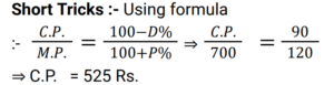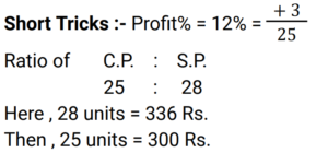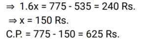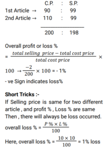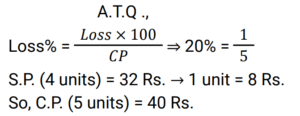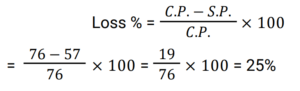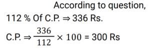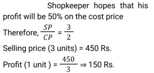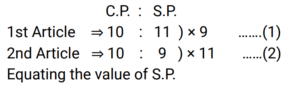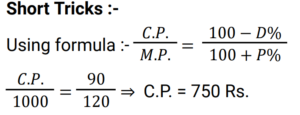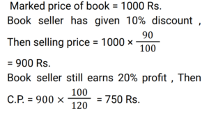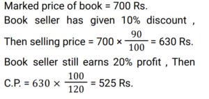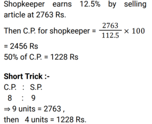 Profit and Loss (Railway Maths) (Part – VII)Total Questions: 4921. If a seller sells a coconut for ₹ 32, he makes a loss of 20%. Find the cost price of the coconut? [ALP Tier II 23/01/2019 (Afternoon) ](a) 36(b) 44(c) 48(d) 40Correct Answer: (d) 40Solution:22. A shopkeeper is expected to make a profit of 50% on his cost price. If in a week, his sales were ₹450, what was his profit? [ALP Tier II 08/02/2019 (Morning) ](a) ₹200(b) ₹150(c) ₹180(d) ₹250Correct Answer: (b) ₹150Solution:23. The printed price of a book is 700 rupees. The book manufacturer has given a 10% discount on it. If he still earns 20% profit then what will be the cost of the book (in rupees)? [RPF Constable 17/01/2019 (Morning)](a) 515(b) 525(c) 535(d) 545Correct Answer: (b) 525Solution:24. A shopkeeper sells two articles at Rs. 594 each. In one article he earned a profit of 10% and in the other one incurred a loss of 10%. Find the overall profit or loss percentage. [RPF Constable 18/01/2019 (Morning)](a) 4% Loss(b) 1% Loss(c) 1% Profit(d) 4% ProfitCorrect Answer: (b) 1% LossSolution:25. A shopkeeper bought one item for 108 rupees and sold it for 135 rupees. Find the percentage of profit (in %). [RPF Constable 18/01/2019 (Afternoon)](a) 20(b) 25(c) 15(d) 30Correct Answer: (b) 25Solution:26. One shopkeeper bought an item for 76 rupees and sold it for 57 rupees. Find the percentage of losses. (In %) [RPF Constable 18/01/2019 (Afternoon)](a) 15(b) 20(c) 10(d) 25Correct Answer: (d) 25Solution:27. The face value of a book is Rs. 1000. A book seller offers a discount of 10% on this. If he still earns 20% profit then what will be the cost of the book? (In rupees) [RPF Constable 18/01/2019 (Evening)](a) 740(b) 750(c) 760(d) 770Correct Answer: (b) 750Solution:28. A merchant sells an item at a rate of Rs. 336 and earns 12% profit. Find the cost value of that item. [RPF Constable 19/01/2019 (Morning)](a) Rupee 300(b) Rupee 430(c) Rupee 397(d) Rupee 350Correct Answer: (a) Rupee 300Solution:29. The loss incurred by selling an article for Rs. 535 is 60% of the profit made by selling the same article for Rs. 775. Find the cost price (in Rs.) of that article. [RPF S.I. 06/01/2019 (Afternoon)](a) 625(b) 615(c) 610(d) 600Correct Answer: (a) 625Solution:30. A shopkeeper earns 12.5% profit by selling an item at a price of Rs. 2,763. Calculate half of the original cost of that item. (In rupees) [RPF S.I. 06/01/2019 (Afternoon)](a) 1,229(b) 1,228(c) 1,226(d) 1,227Correct Answer: (b) 1,228Solution:Submit Quiz« Previous12345Next »