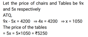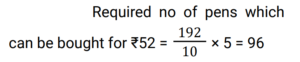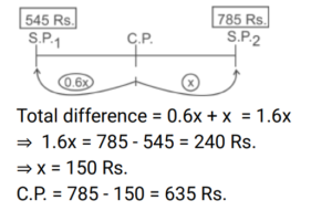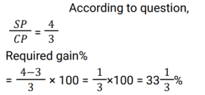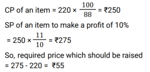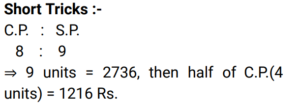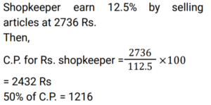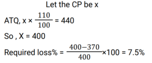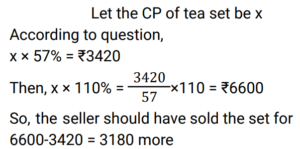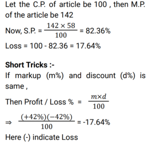 Profit and Loss (Railway Maths) (Part – VII)Total Questions: 4931. If a shopkeeper increases the cost price of an article by 42% and after marking the price it up allows a discount of 42% on its sale, then find the overall percentage gain or loss on it. [RPF S.I. 10/01/2019 (Morning)](a) Profit of 16.64%(b) Loss of 16.64%(c) Loss of 17.64%(d) Profit of 17.64%Correct Answer: (c) Loss of 17.64%Solution:32. Selling an item for 545 rupees is the loss of 60% more than to get the profit obtained by selling the same item at 785 rupees. Know the purchase price of that item? (In rupees) [RPF S.I. 10/01/2019 (Morning) ](a) 645(b) 635(c) 615(d) 625Correct Answer: (b) 635Solution:33. A shopkeeper sells a product at Rs.2736 and earns 12.5% profit. Tell the amount that is equal to half of the purchase price of the product. (In rupees) [RPF S.I. 10/01/2019 (Morning) ](a) 1,216(b) 1,214(c) 1,212(d) 1,218Correct Answer: (a) 1,216Solution:34. To dispose of the old stocks, a person sold a tea set for ₹ 3,420, which was 43% below the cost price. In order to make a profit of 10% the seller should have sold the set for ₹________ more. [RRB ALP 09/08/2018 (Evening) ](a) ₹ 1,812.60(b) ₹ 3,180(c) ₹ 2,580(d) ₹ 2,664.42Correct Answer: (b) ₹ 3,180Solution:35. The selling price of an item inclusive of a 10% profit was ₹ 440. What would be the percentage loss if the item was sold for ₹ 370? [RRB ALP 10/08/2018 (Morning) ](a) 8(b) 7.5(c) 8.4(d) 6.25Correct Answer: (b) 7.5Solution:36. If 192 pens cost is ₹10, how many pens can be bought for ₹ 5. [RRB ALP 13/08/2018 (Evening) ](a) 56(b) 96(c) 48(d) 72Correct Answer: (b) 96Solution:37. The prices of chairs and tables are in the ratio of 9:5. If the chairs cost ₹ 4200 more than the tables, Find the price of the tables? (in ₹) [RRB ALP 14/08/2018 (Evening) ](a) 6730(b) 5250(c) 5000(d) 6200Correct Answer: (b) 5250Solution:38. Find the answer of given question? [RRB ALP 14/08/2018 (Evening) ](a)(b)(c)(d)Correct Answer: (b)Solution:39. Junko sold an item for ₹220 at a loss of 12% By how much should she have raised the price to make a profit of 10%? [RRB ALP 17/08/2018 (Evening) ](a) ₹ 55(b) ₹ 44(c) ₹ 25(d) ₹ 48.40Correct Answer: (a) ₹ 55Solution:40. Find the answer of given question? [RRB ALP 20/08/2018 (Afternoon) ](a)(b)(c)(d)Correct Answer: (b)Solution:Submit Quiz« Previous12345Next »