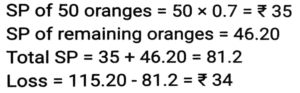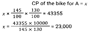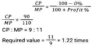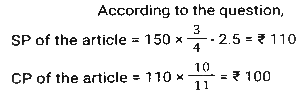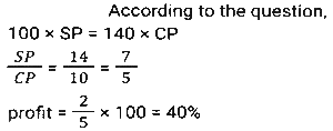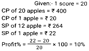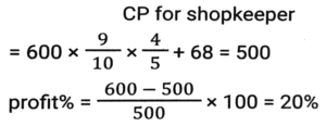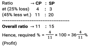 Profit and Loss (SSC-Maths) (Part-3)Total Questions: 5011. Ravi sells his goods at a 25% loss on cost price but uses 45% less weight. What is his percentage profit or loss? [SSC CHSL 01/07/2024 (2nd Shift)](a) Loss, 47 ⁹⁄₁₀ %(b) Loss, 36 ⁴⁄₁₁ %(c) Profit, 36 ⁴⁄₁₁ %(d) Profit, 47 ⁹⁄₁₀ %Correct Answer: (c) Profit, 36 ⁴⁄₁₁ %Solution:12. A shopkeeper gives a 10% discount and still earns 10% profit. The marked price of the item is how many times (correct to 2 decimal places) the cost price? [SSC CHSL 01/07/2024 (3rd Shift)](a) 1.28(b) 1.20(c) 1.22(d) 1.24Correct Answer: (c) 1.22Solution:13. If the selling price of 100 pens is equal to the cost price of 140 pens, find the profit percentage. [SSC CHSL 01/07/2024 (3rd Shift)](a) 30%(b) 40%(c) 45%(d) 36%Correct Answer: (b) 40%Solution:14. A merchant sold two refrigerators for ₹10,000 each. On one refrigerator, he incurred a 20% loss, and on the other, he gained 20%. What was his profit/loss percentage on the whole transaction? [SSC CHSL 02/07/2024 (1st Shift)](a) Profit of 2%(b) Loss of 2%(c) Loss of 4%(d) Profit of 4%Correct Answer: (c) Loss of 4%Solution:15. A shopkeeper marks an article at 150 and sells it at a discount of 25%. He also gives a gift worth ₹2.5. If he still makes a 10% profit, then the cost price (in ₹) of the article is: [SSC CHSL 02/07/2024 (3rd Shift)](a) 175(b) 100(c) 125(d) 112Correct Answer: (b) 100Solution:16. A shopkeeper bought 288 oranges for ₹115.20. He sold 50 of them at 70 paise each and the remaining at 46.20. Find his profit or loss. [SSC CHSL 02/07/2024 (3rd Shift)](a) Loss, ₹36(b) Loss, ₹34(c) Profit, ₹37(d) Profit, ₹25Correct Answer: (b) Loss, ₹34Solution:17. The difference between the cost price and the selling price of an article is 1,800. If there is a profit of 20%, then the cost price of the article is: [SSC CHSL 02/07/2024 (4th Shift)](a) ₹7,000(b) ₹11,000(c) ₹8,000(d) ₹9,000Correct Answer: (d) ₹9,000Solution:18. A retail fruit vendor buys a score of apples for ₹400 and retails them for 264 at a dozen. What was his loss/gain per cent? (a score = 20 no's) [SSC CHSL 03/07/2024 (1st Shift)](a) 20% profit(b) 5% loss(c) 10% loss(d) 10% profitCorrect Answer: (d) 10% profitSolution:19. The marked price of an article is ₹600. A shopkeeper purchased it on two successive discounts of 10% and 20%. He spent ₹68 on transportation and sold the article for ₹600. Find his gain or loss percentage. [SSC CHSL 03/07/2024 (1st Shift)](a) 15% Profit(b) 20% Profit(c) 18% Loss(d) 25% LossCorrect Answer: (b) 20% ProfitSolution:20. A sells a bike to B at 45% profit. Then B sells it to C at 30% profit. If C pays 43,355, then what is the cost price of the bike for A ? [SSC CHSL 03/07/2024 (2nd Shift)](a) ₹21,000(b) ₹23,000(c) ₹27,000(d) ₹29,000Correct Answer: (b) ₹23,000Solution:Submit Quiz« Previous12345Next »