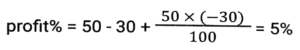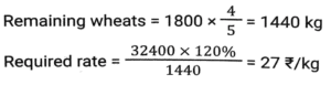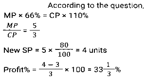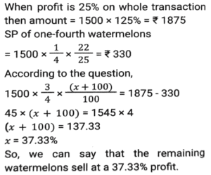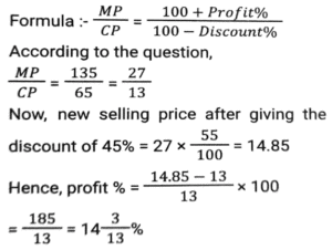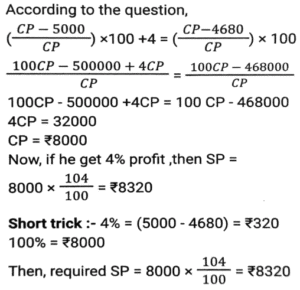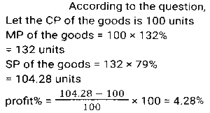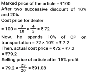 Profit and Loss (SSC) (Part-3)Total Questions: 5021. By selling an article at 66% of its marked price, a merchant makes a profit of 10%. If he sells the article at 80% of its marked price, then the profit percentage will be: [SSC CHSL 03/07/2024 (2nd Shift)](a) 33 ⅓ %(b) 25 %(c) 33 ⅔ %(d) 20 %Correct Answer: (a) 33 ⅓ %Solution:22. A dealer buys an article listed at 100 and get successive discounts of 10% and 20%. He spends 10% of the cost price on transportation. At what price should he sell the article to earn a profit of 15%? [SSC CHSL 03/07/2024 (3rd Shift)](a) ₹76.07(b) ₹89.08(c) ₹91.08(d) ₹81.07Correct Answer: (c) ₹91.08Solution:23. A seller decreased the selling price of each item from ₹5,000 to ₹4,680, by which his loss percentage increased by 4%. If he has to get 4% profit, then the selling price of the item should be: [SSC CHSL 03/07/2024 (4th Shift)](a) ₹8,840(b) ₹8,320(c) ₹7,800(d) ₹7,280Correct Answer: (b) ₹8,320Solution:24. Gaurav marks his goods 50% above the cost price and offers a discount of 30% on the marked price to his customers. What is his percentage gain? [SSC CHSL 04/07/2024 (1st Shift)](a) 4%(b) 3%(c) 2%(d) 5%Correct Answer: (d) 5%Solution:25. A retailer purchased a batch of goods for ₹5,000. Due to a manufacturing defect, 5% of the goods were damaged. If the retailer wants to make a profit of 20% on the remaining goods, at what price should the undamaged goods be sold? [SSC CHSL 04/07/2024 (3rd Shift)](a) ₹5,800(b) ₹5,700(c) ₹5,900(d) ₹6,000Correct Answer: (b) ₹5,700Solution:26. A 35% profit is made when a discount of 35% is given on the marked price of an item. When the discount is 45%, then the profit percentage will be: [SSC CHSL 04/07/2024 (4th Shift)](a) 11 ³⁄₁₃ %(b) 13 ³⁄₁₃ %(c) 17 ¹⁄₁₃ %(d) 14 ³⁄₁₃ %Correct Answer: (d) 14 ³⁄₁₃ %Solution:27. A shopkeeper buys 1800 kg wheat for ₹32,400. If 20% of this wheat is spoiled due to rain, at what rate (₹/kg) should he sell the rest to earn 20%? [SSC CHSL 04/07/2024 (4th Shift)](a) 26(b) 29(c) 27(d) 25Correct Answer: (c) 27Solution:28. Ravath had to sell vegetables worth ₹4,960 for ₹4,712 due to weather conditions. What is the loss percentage that he has incurred? [SSC CHSL 05/07/2024 (1st Shift)](a) 15%(b) 20%(c) 10%(d) 5%Correct Answer: (d) 5%Solution:29. A shopkeeper marks up his goods 32% above the cost price and gives a discount of 21% on the marked price. Find his gain percentage on the goods. [SSC CHSL 05/07/2024 (2nd Shift)](a) 8.24%(b) 8.42%(c) 4.28%(d) 4.82Correct Answer: (c) 4.28%Solution:30. Ramendra purchased some watermelons for ₹1,500. He sold one-fourth of them at a loss of 12%. At what gain percentage should the remaining watermelons be sold so as to gain 25% on the whole transaction (correct to two decimal places)? [SSC CHSL 05/07/2024 (2nd Shift)](a) 37.65%(b) 33.73%(c) 33.43%(d) 37.33%Correct Answer: (d) 37.33%Solution:Submit Quiz« Previous12345Next »